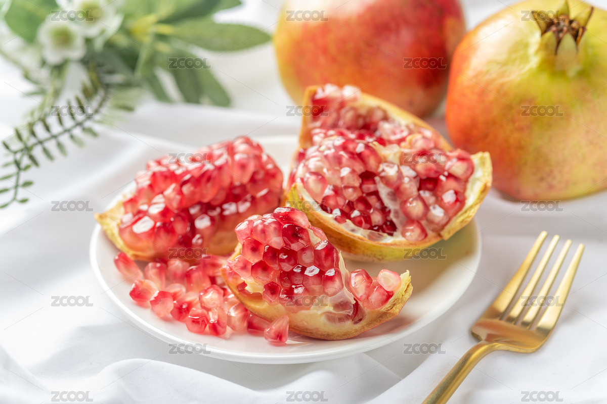 石榴,石榴籽,石榴子,切开的石榴,切开,金色叉子,水果,红石榴,果实,安石榴
