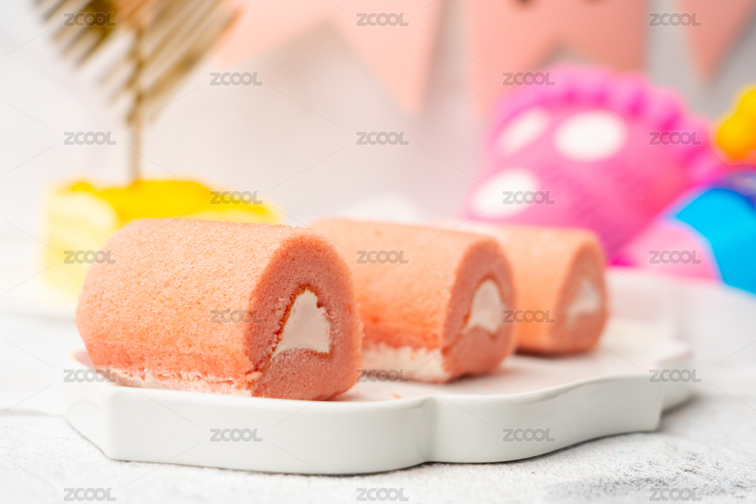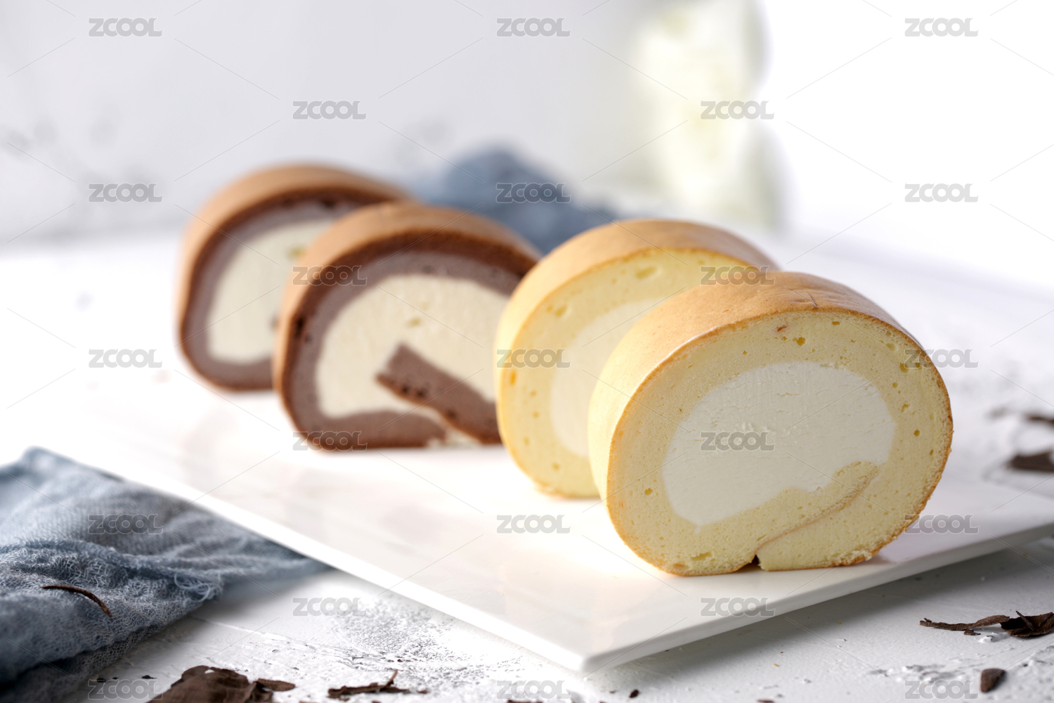 棕色桌面上放着切开的奶牛夹心蛋糕卷