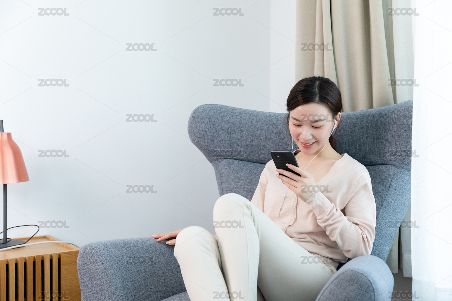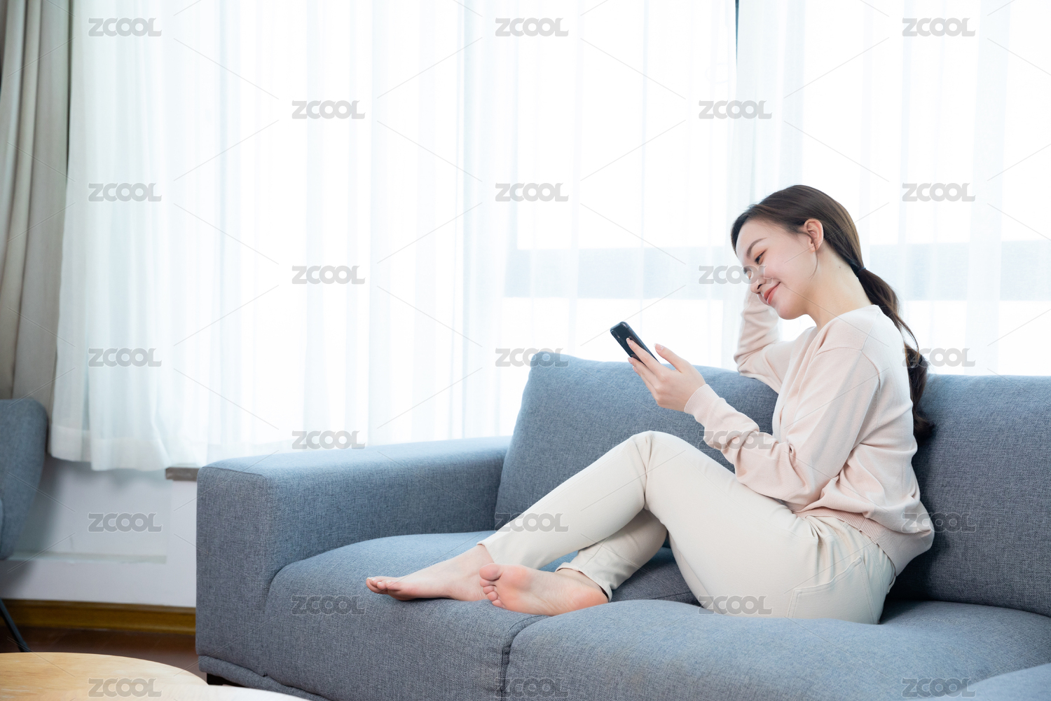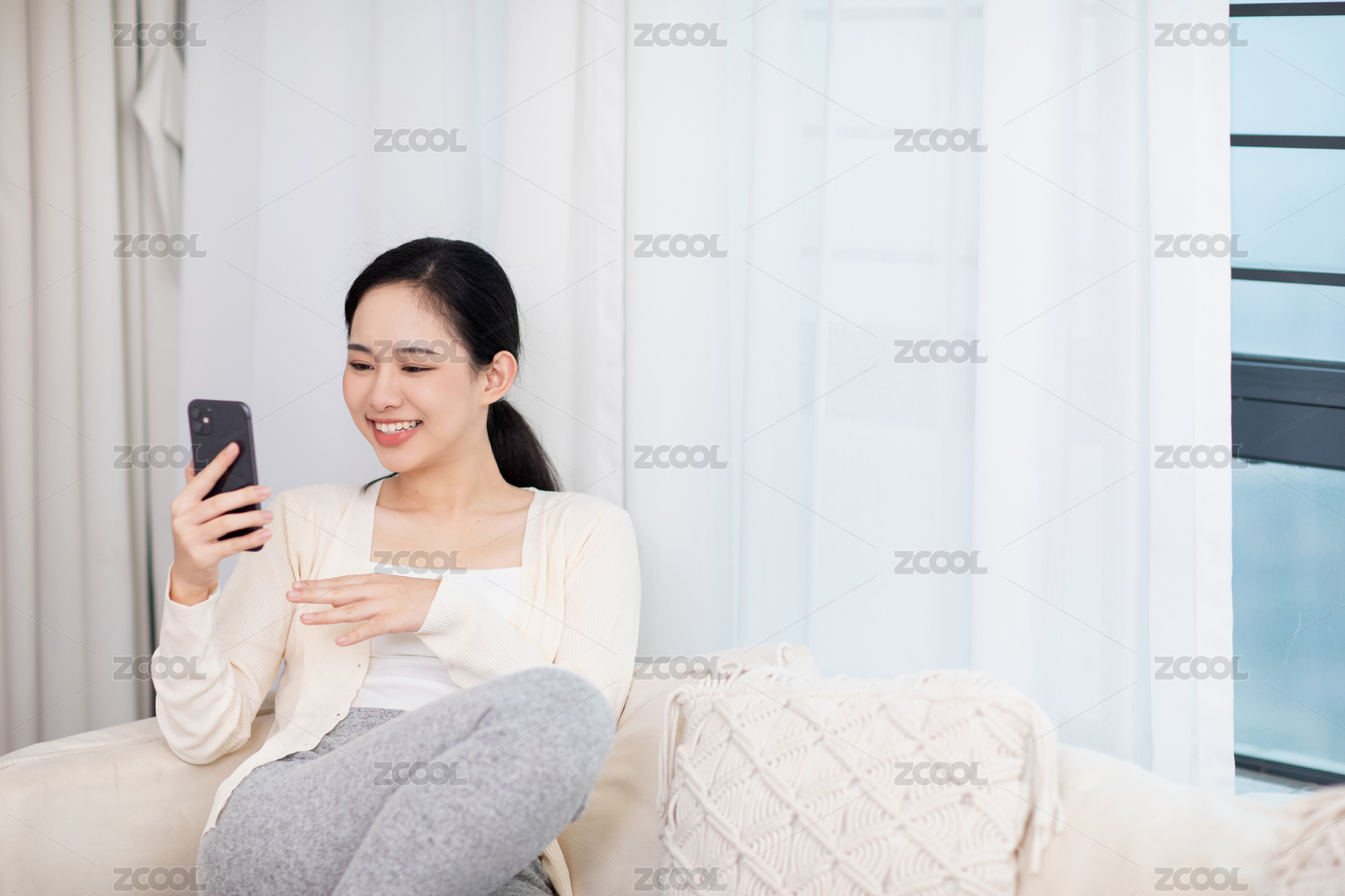 女子刚做完工作用的手机联系朋友在家里客厅坐在沙发上的时候,晚上聊天开心或浏览一些有趣的事情。