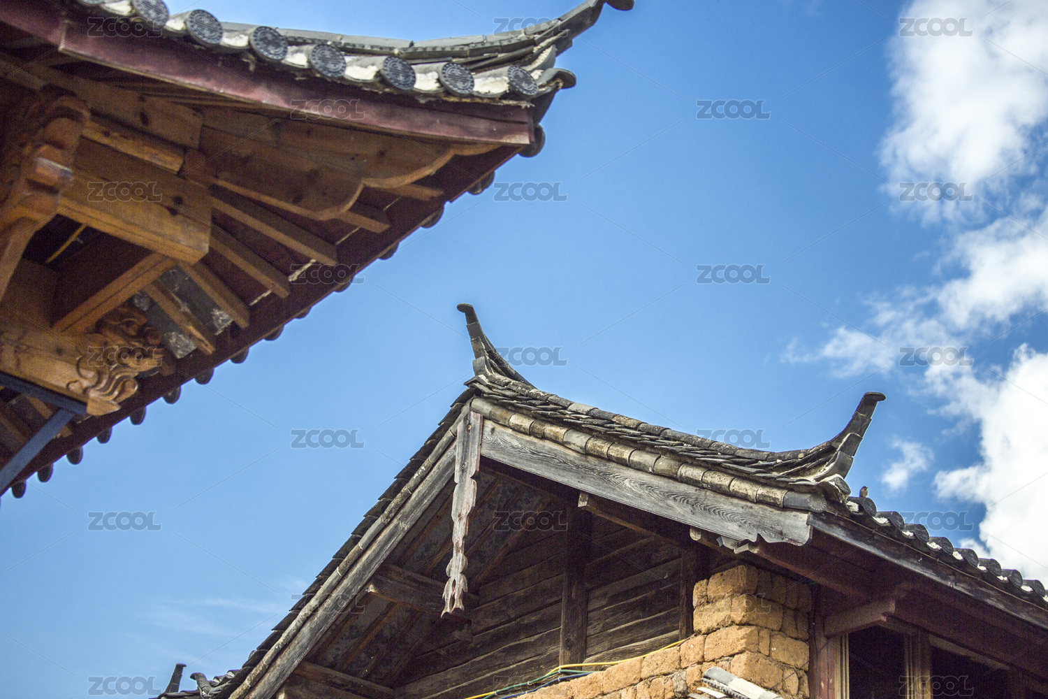 中国云南省丽江市,蔚蓝天空下的古城楼角
