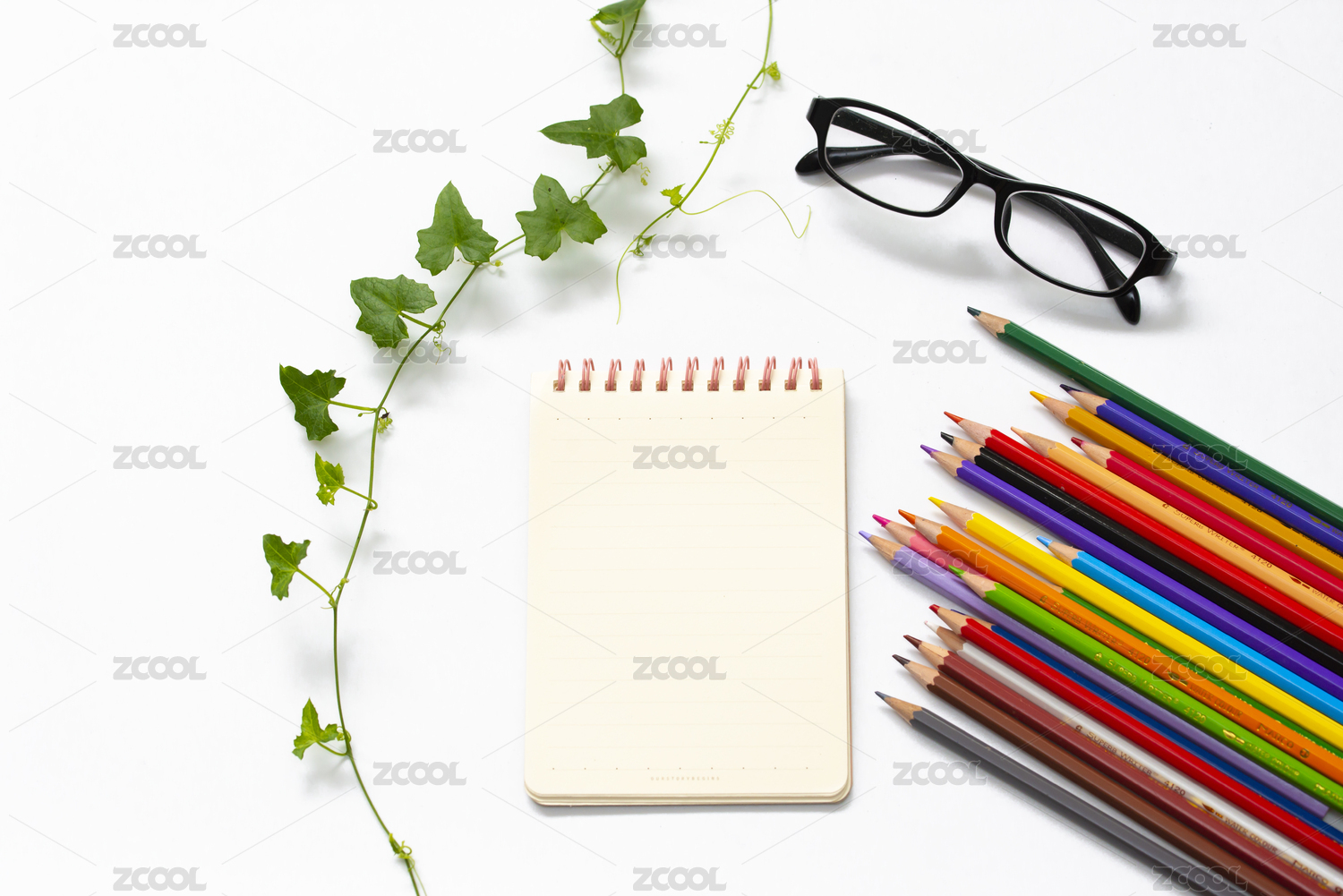 各种文具眼镜彩铅自动笔胶带与绿色藤蔓围绕着一本记事本