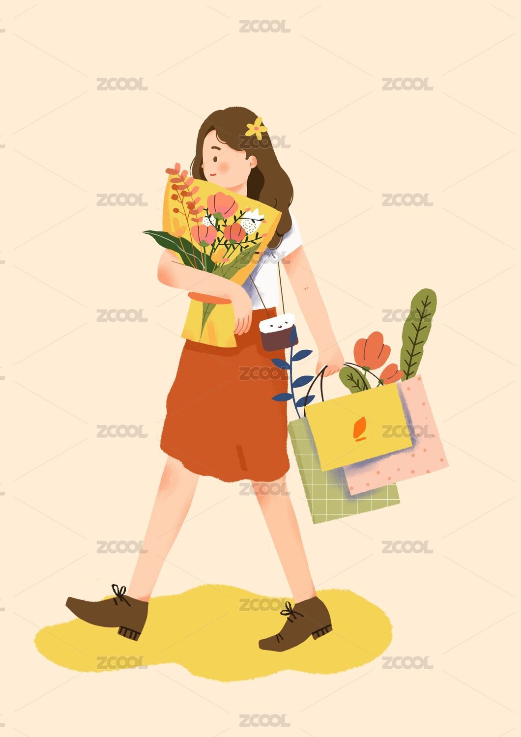 手提购物袋的女人插画 购物袋里长出可爱的植物