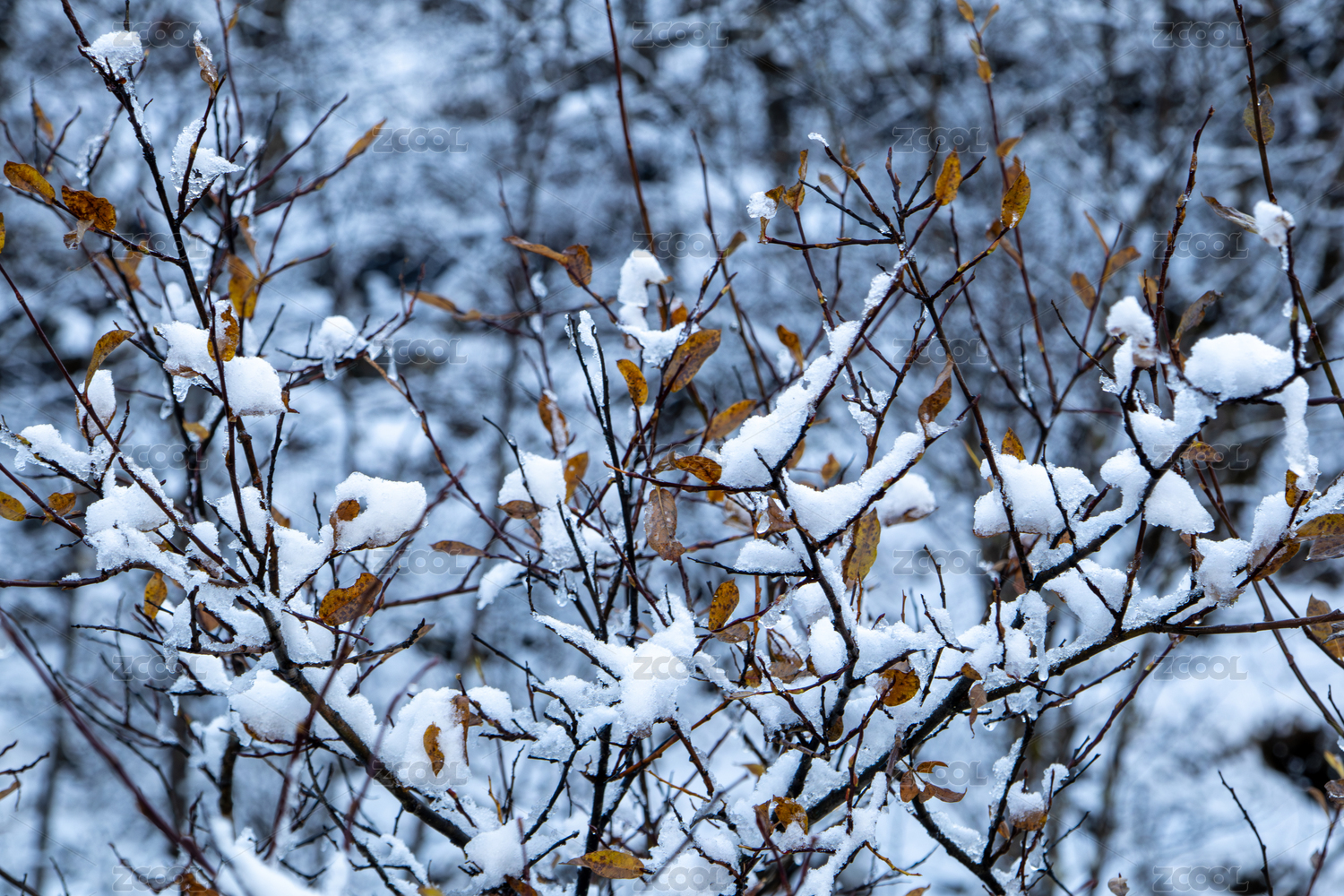 冬季下雪天树林中植物的枝叶上积满了厚厚雪