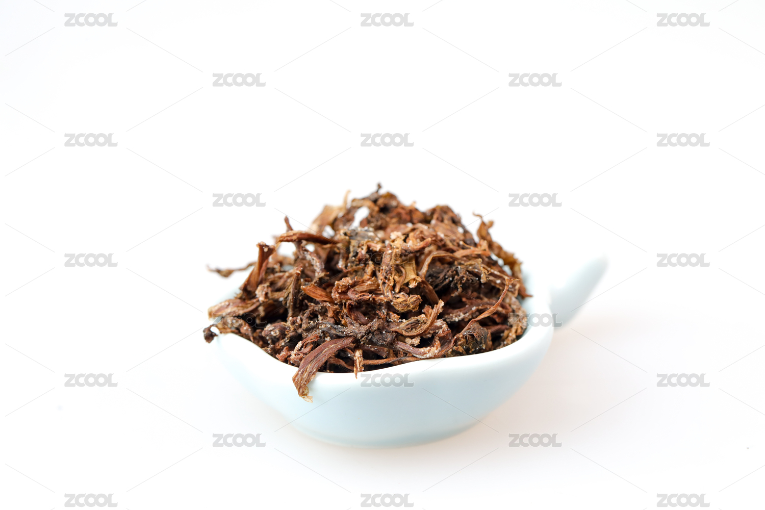放在白色背景上小碗里的干桑叶茶
