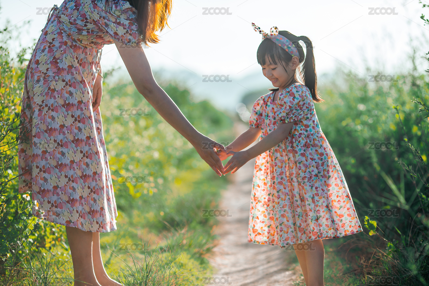 一位母亲带子女儿在田野玩耍