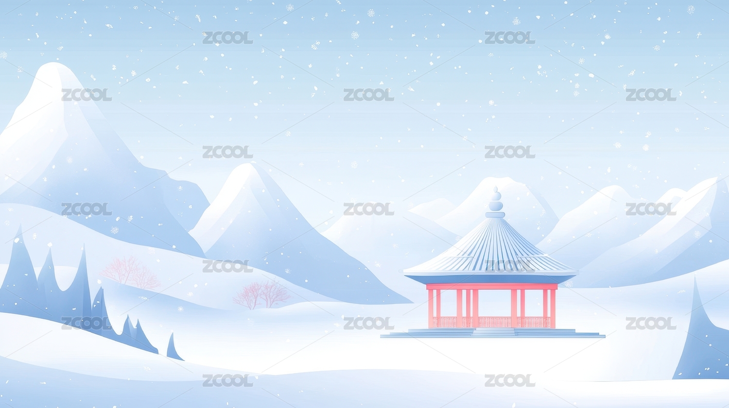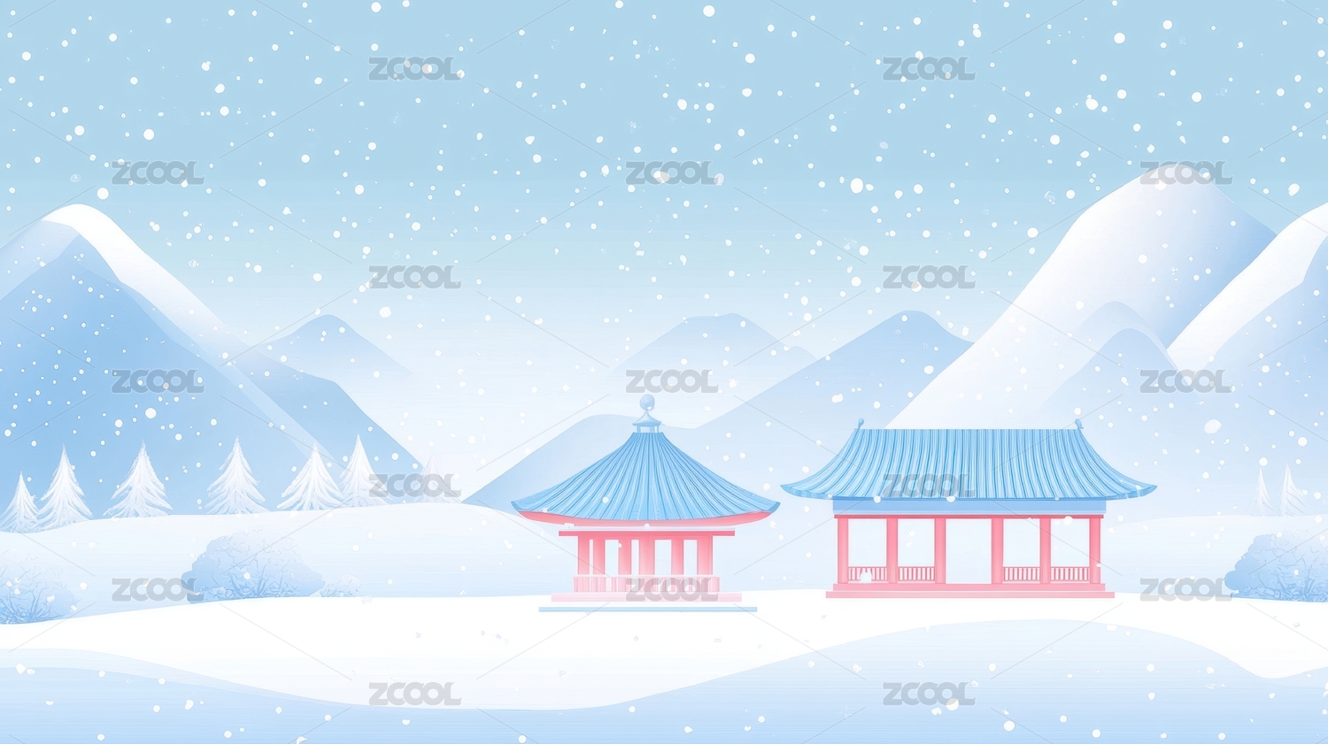 国风意境风景古建筑冬季雪景大雪节气插画