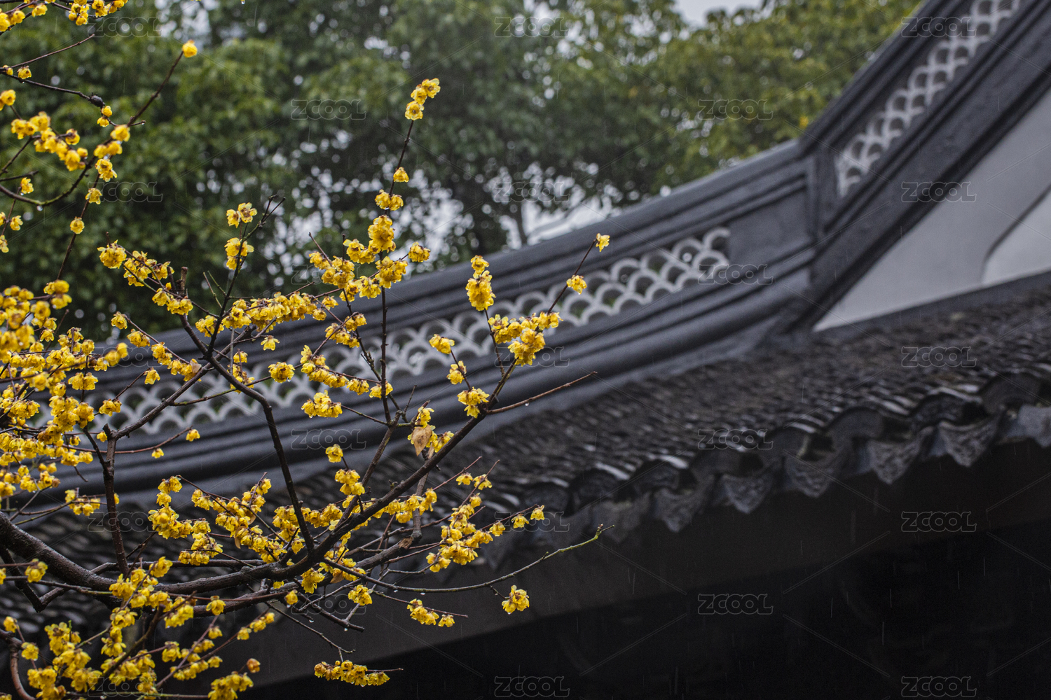 瞻园雨中蜡梅