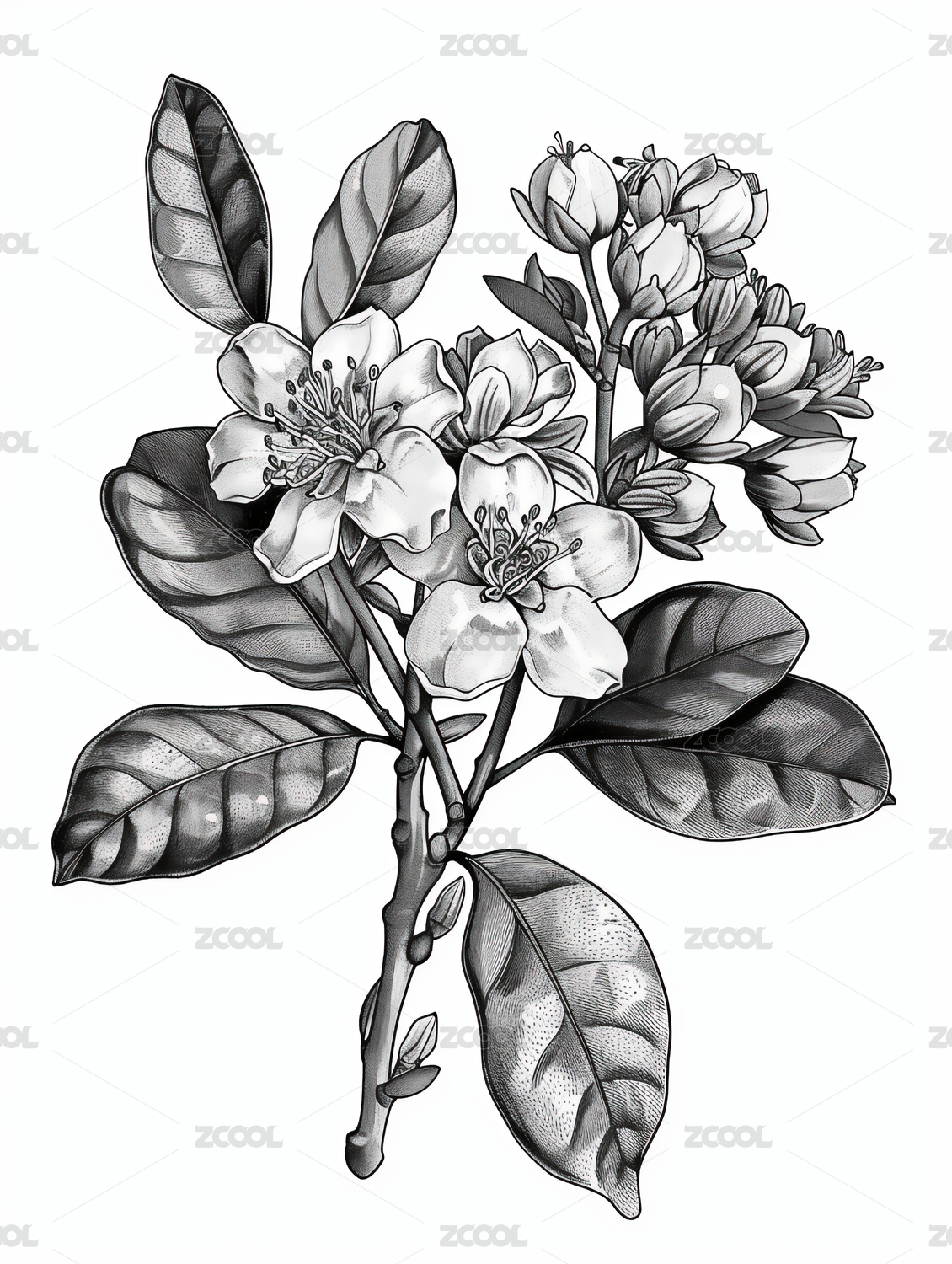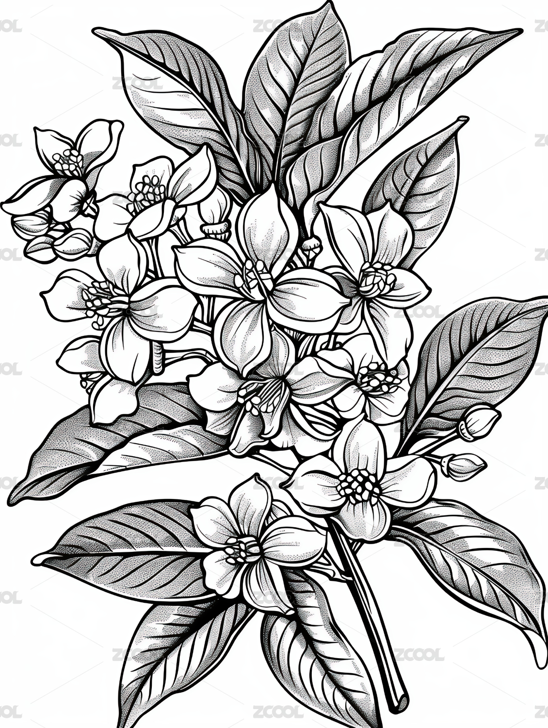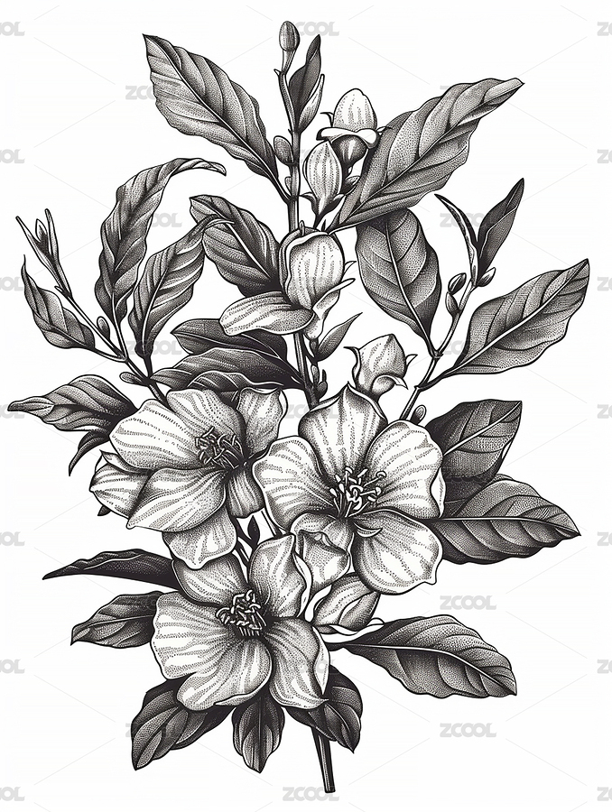 黑白线稿版画风格桂花图案