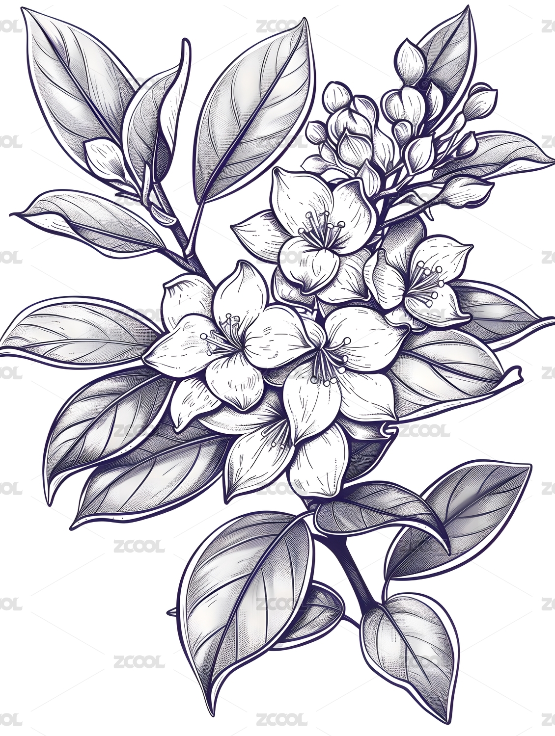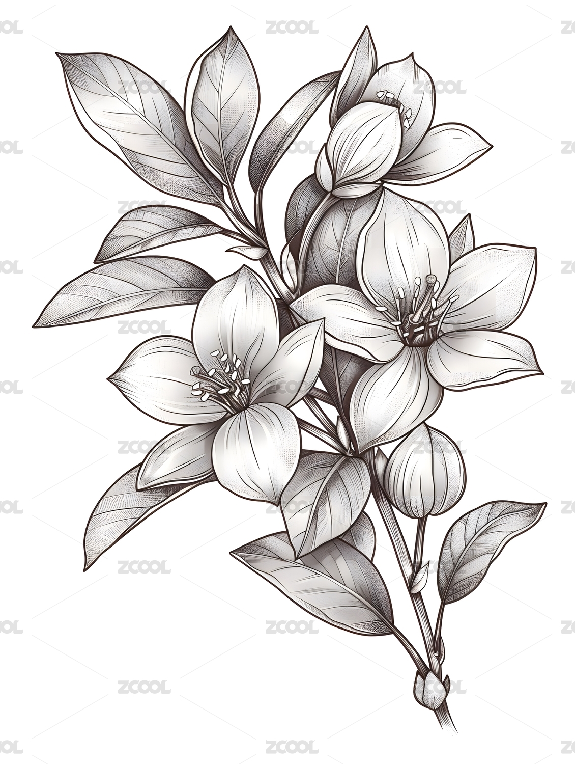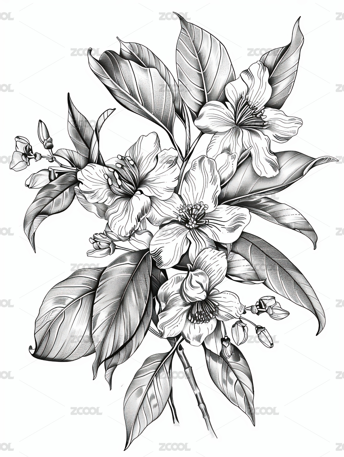 黑白线稿版画风格桂花图案