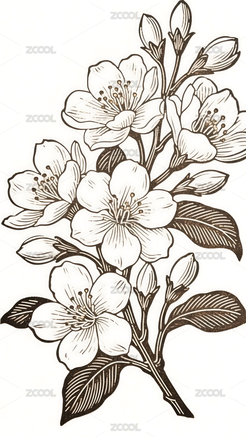 木刻版画线描花枝