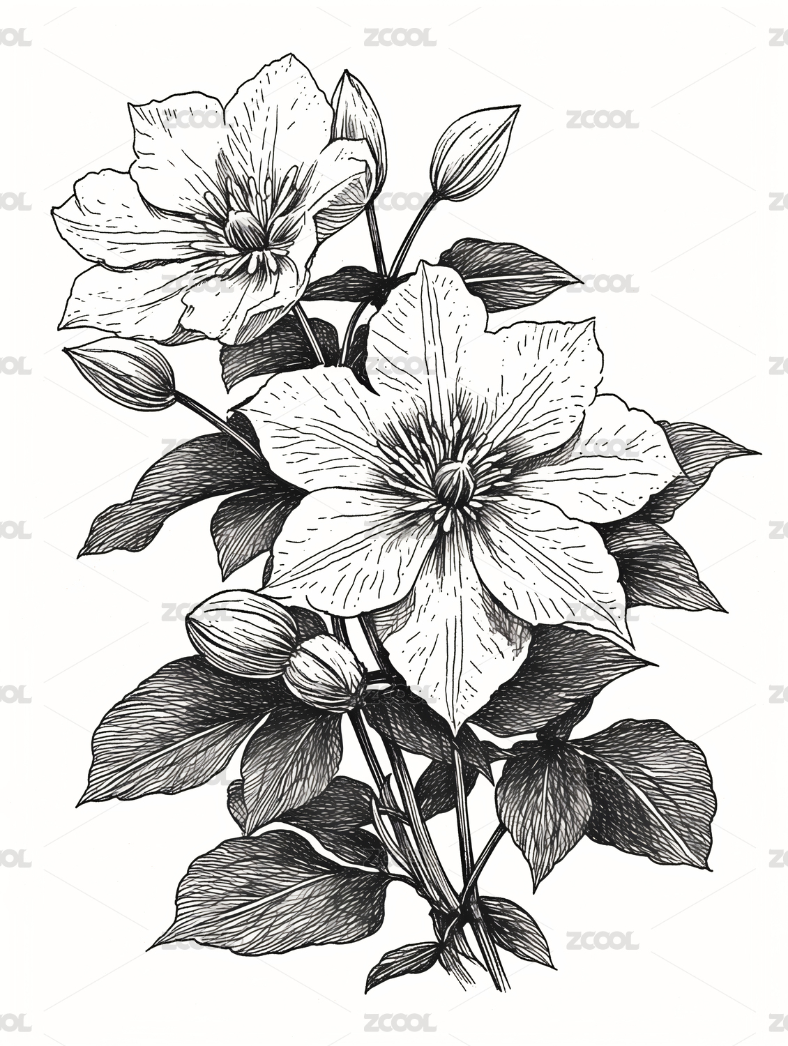 铁线莲花钢笔版画黑白线描插画