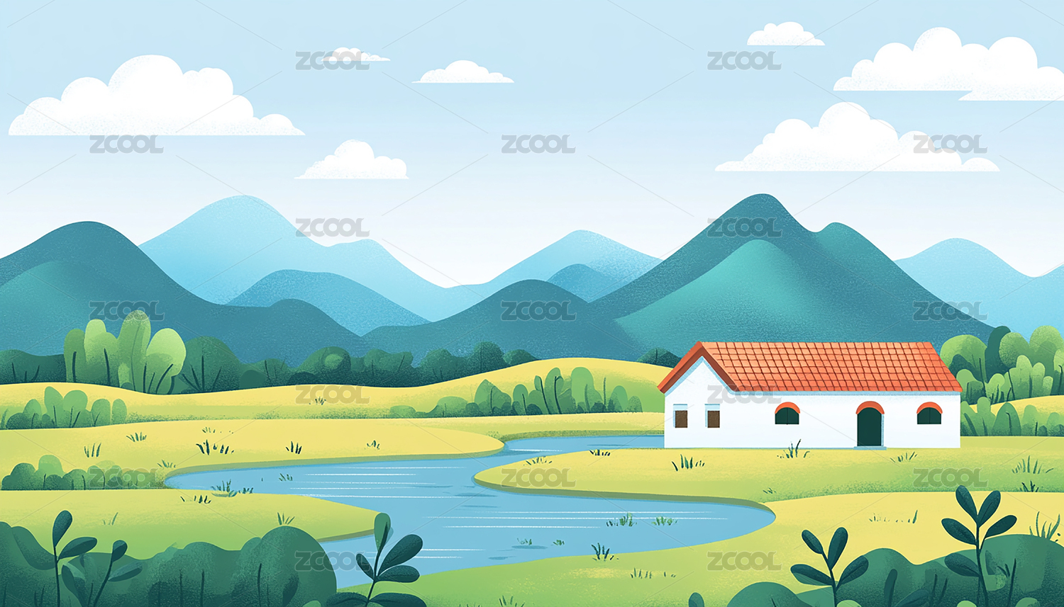 春季,春天,乡村,田园,村庄,河流,风光,插画
