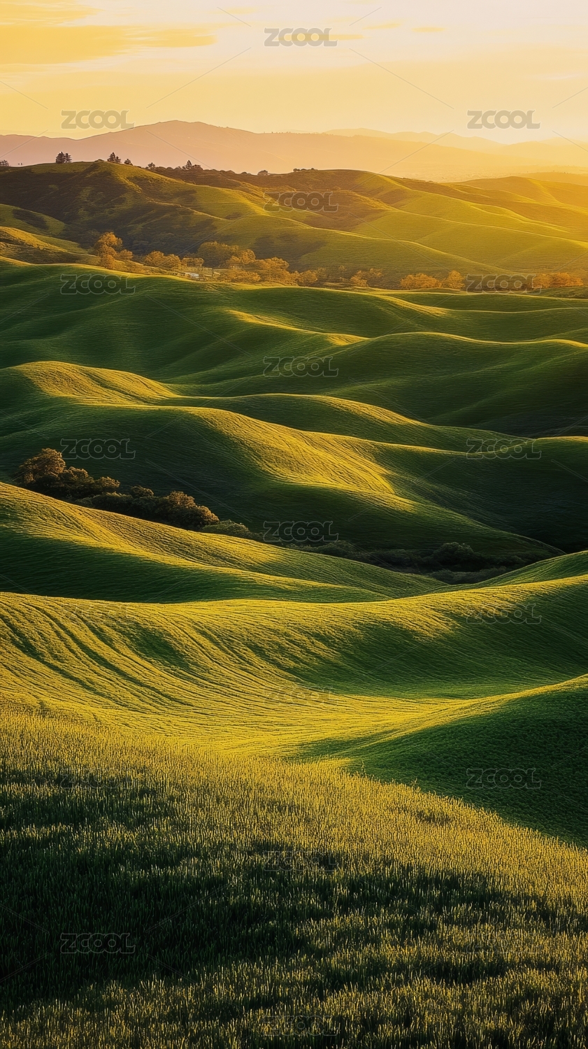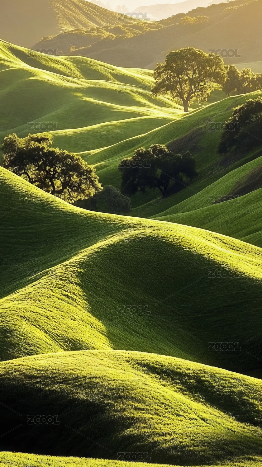 起伏的绿色山丘上点缀着生机勃勃的野花