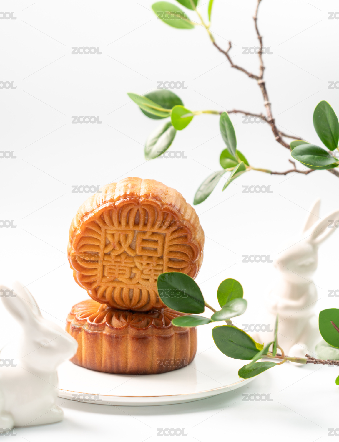 白兔和植物装饰下的 中秋节月饼