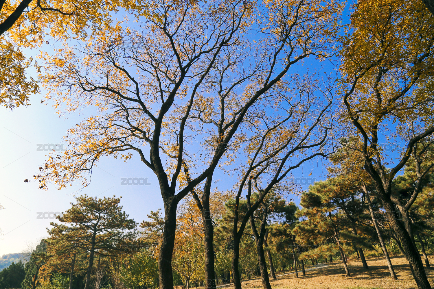 蓝天下两棵分别挂着零星红黄两色叶子的树