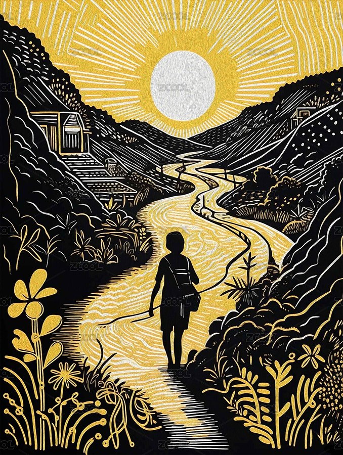 远行,背影,前方,远方,出发,木刻,版画,黄黑,创意