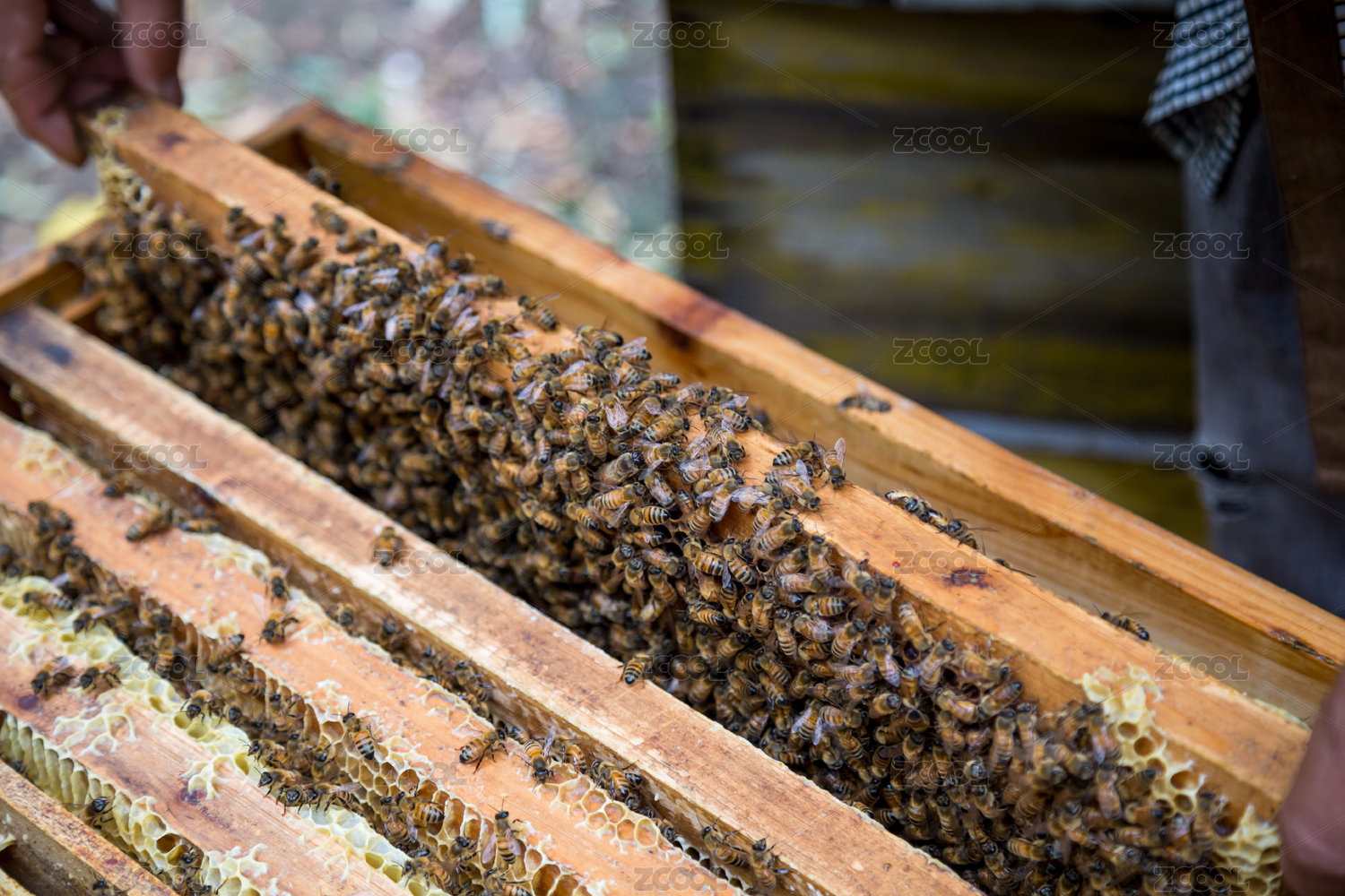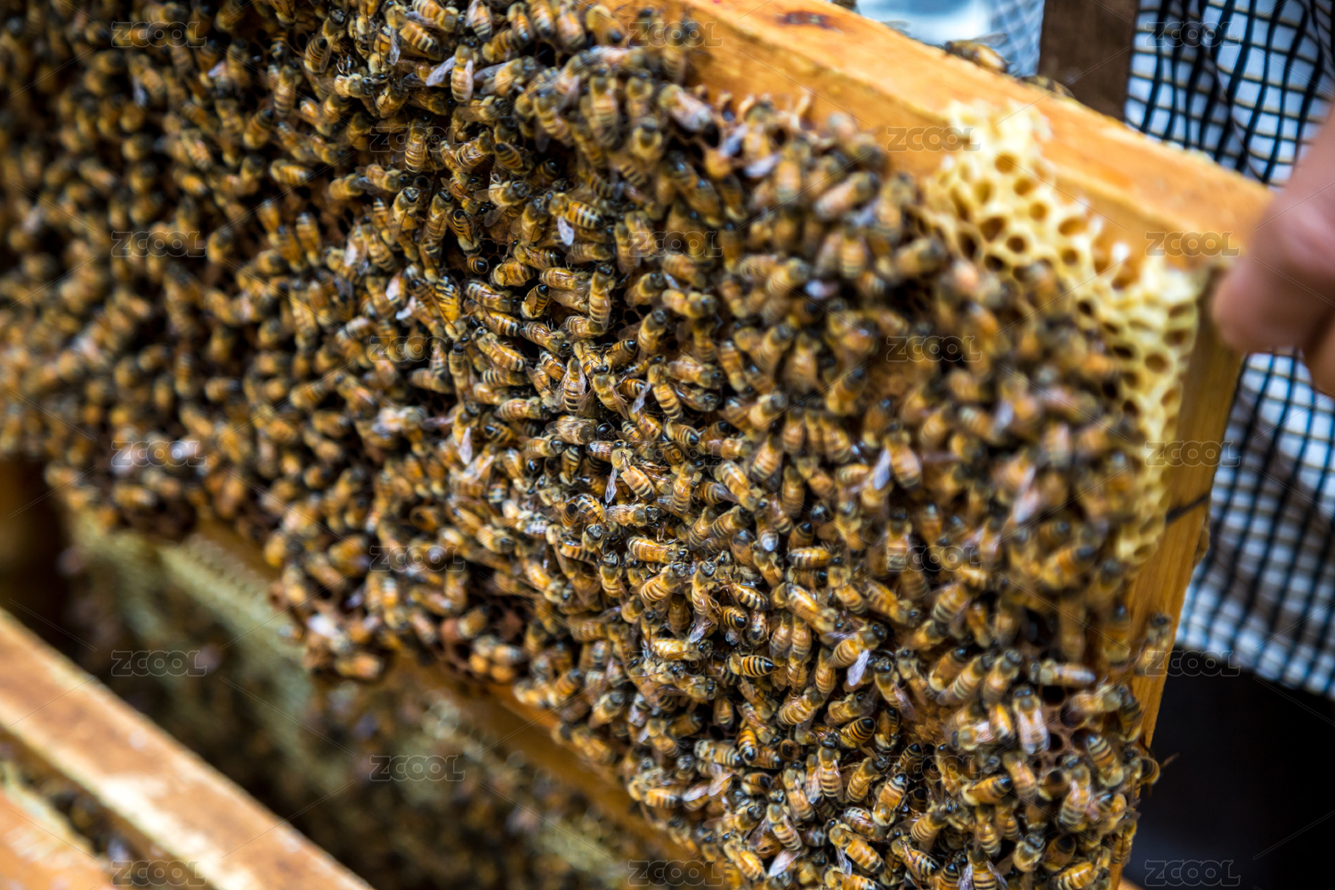 养蜂人和蜜蜂。 养蜂人拿起蜂窝里的充满蜜蜂的木板,收获蜂蜜