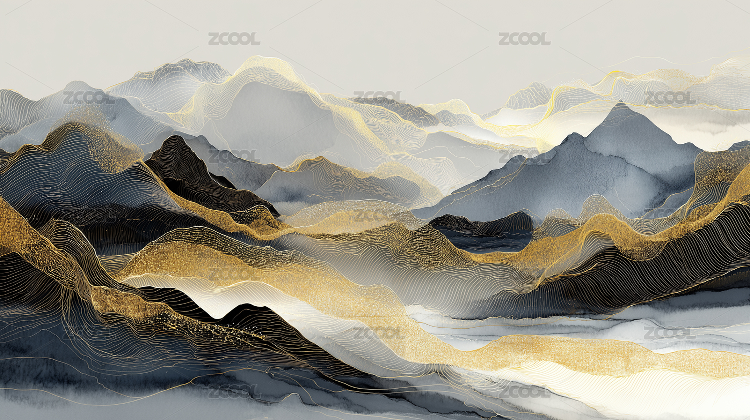 水墨山水风景画金色线条