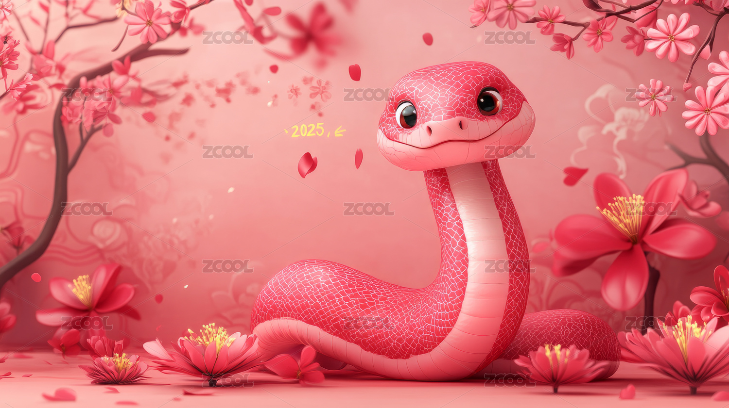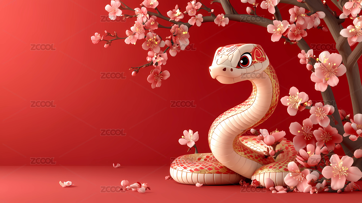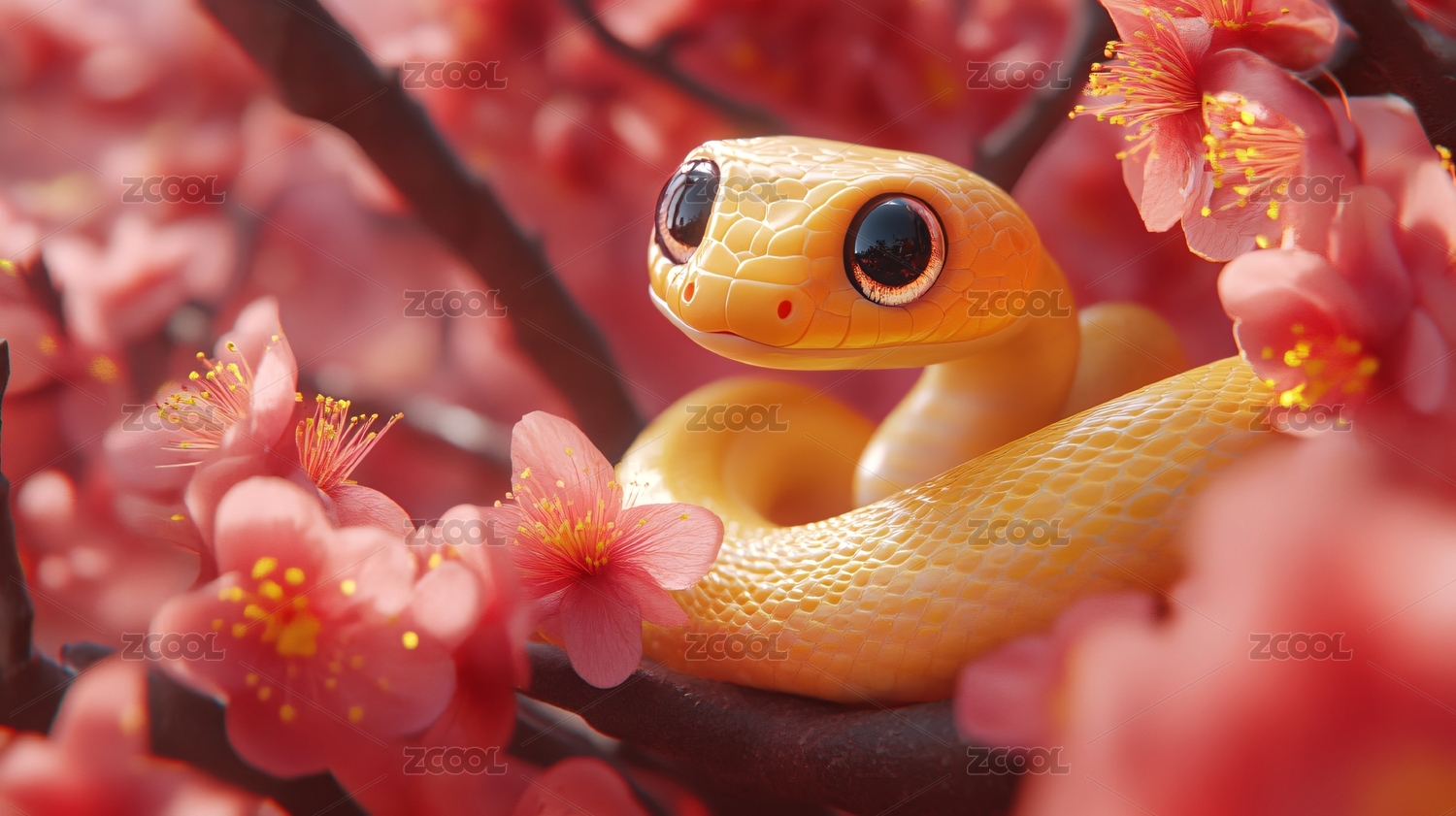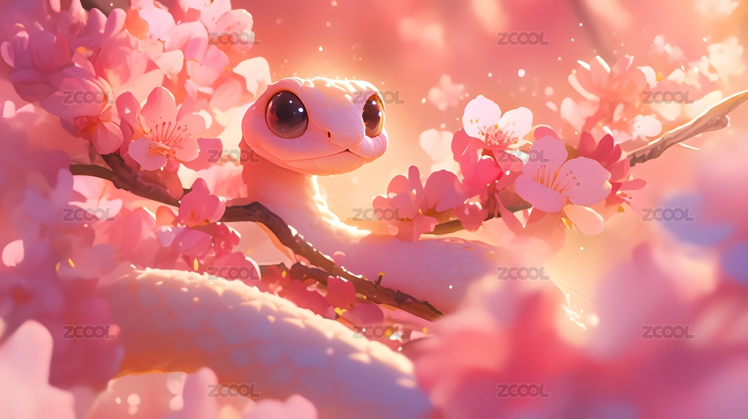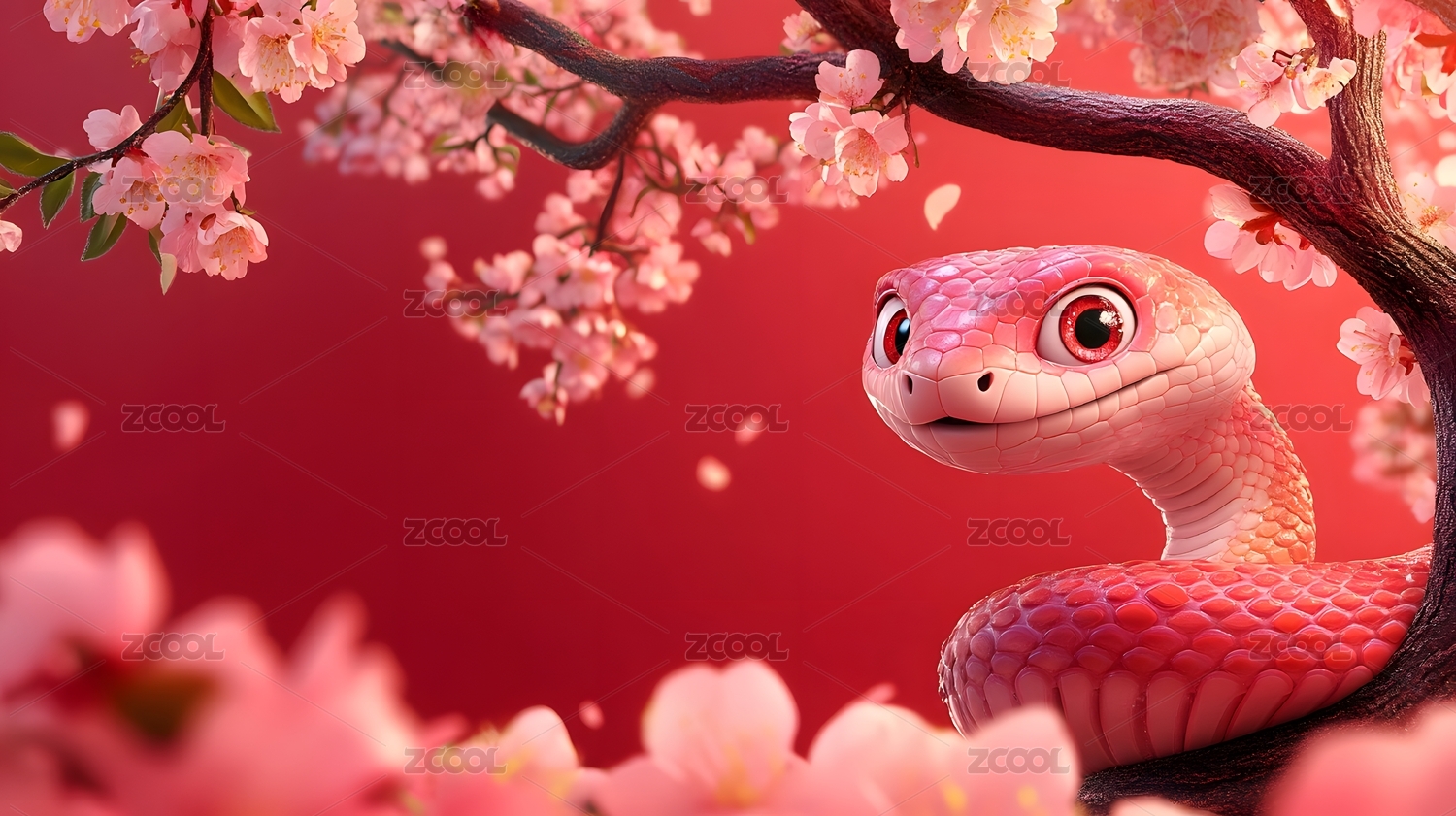 三维,立体,3D,渲染,插画,背景,壁纸,桃花,蛇,中国风