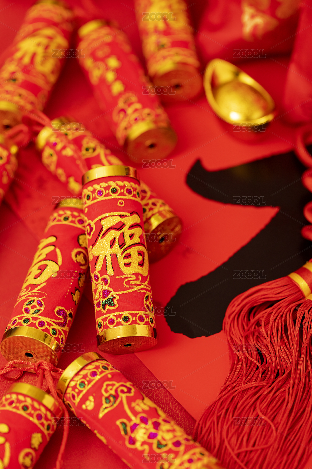 摆放在红色背景上的福字鞭炮