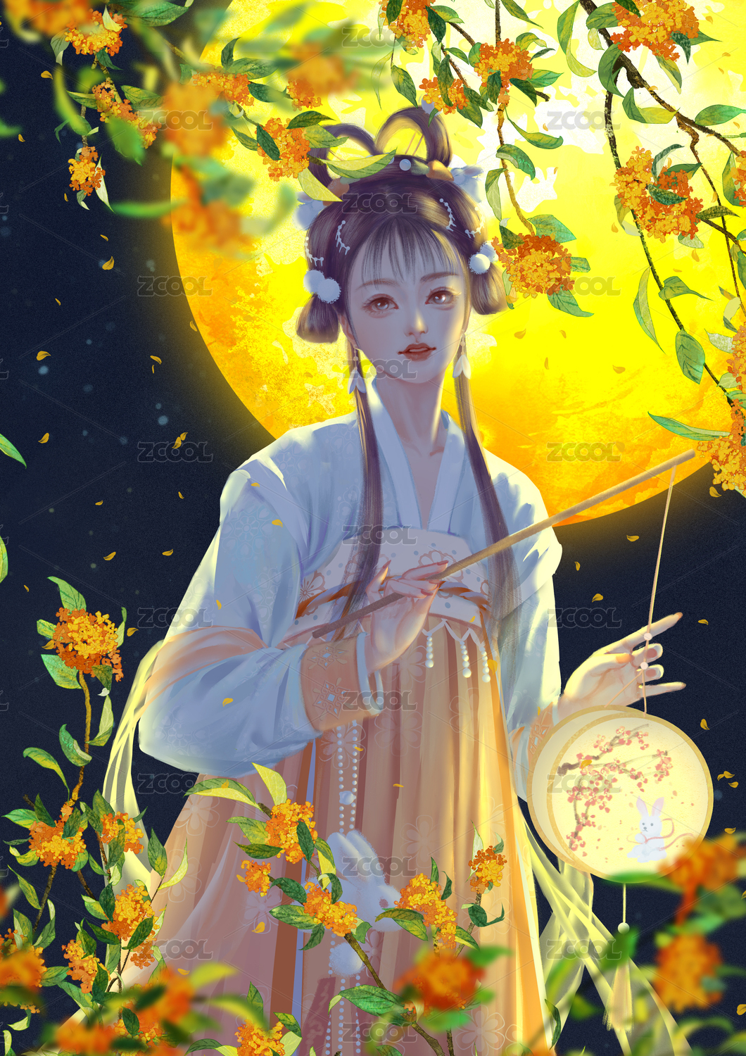 夜晚星空桂花树下古风女子提兔子花灯笼图