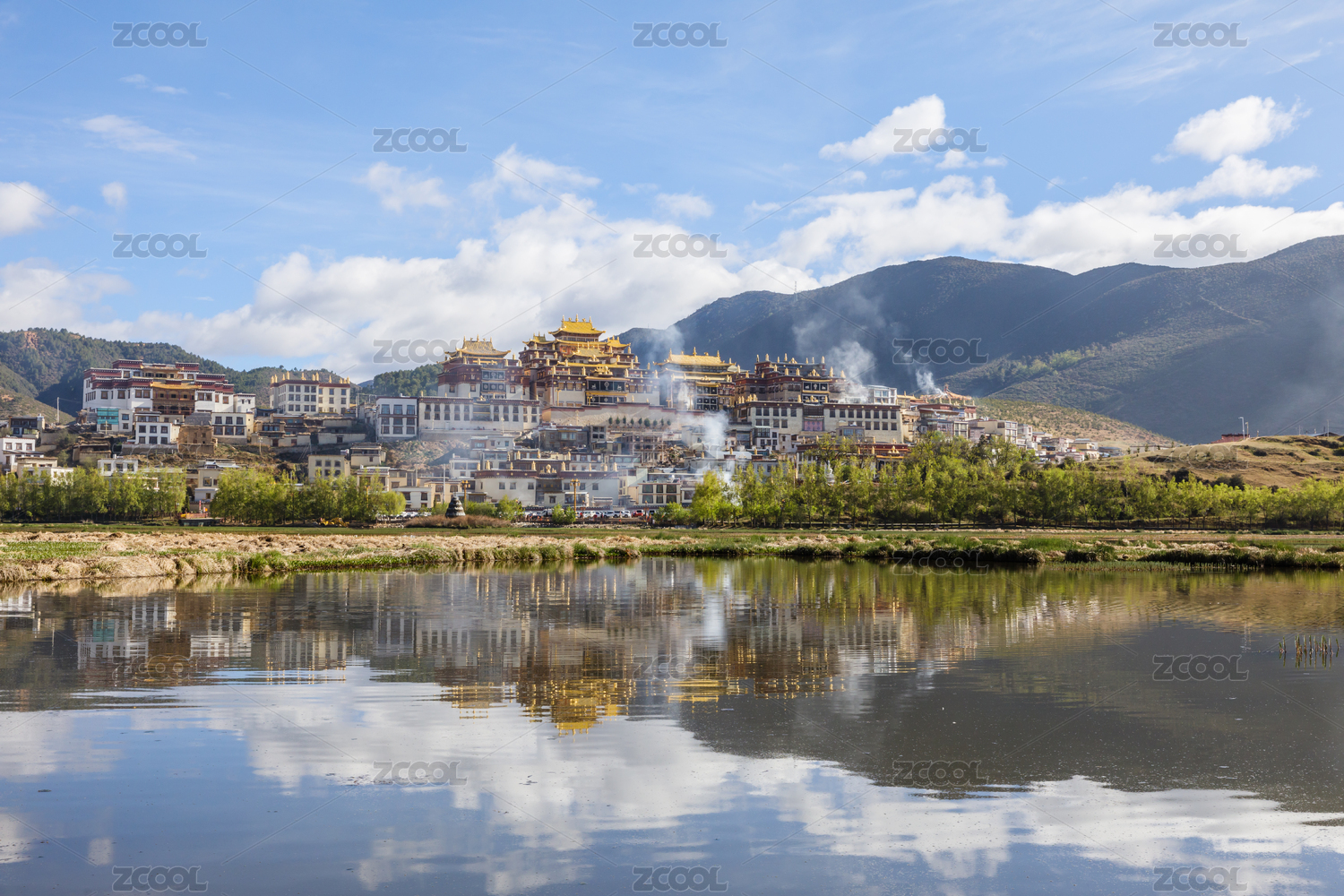 中国云南香噶丹松赞林寺在拉姆央措中的倒影