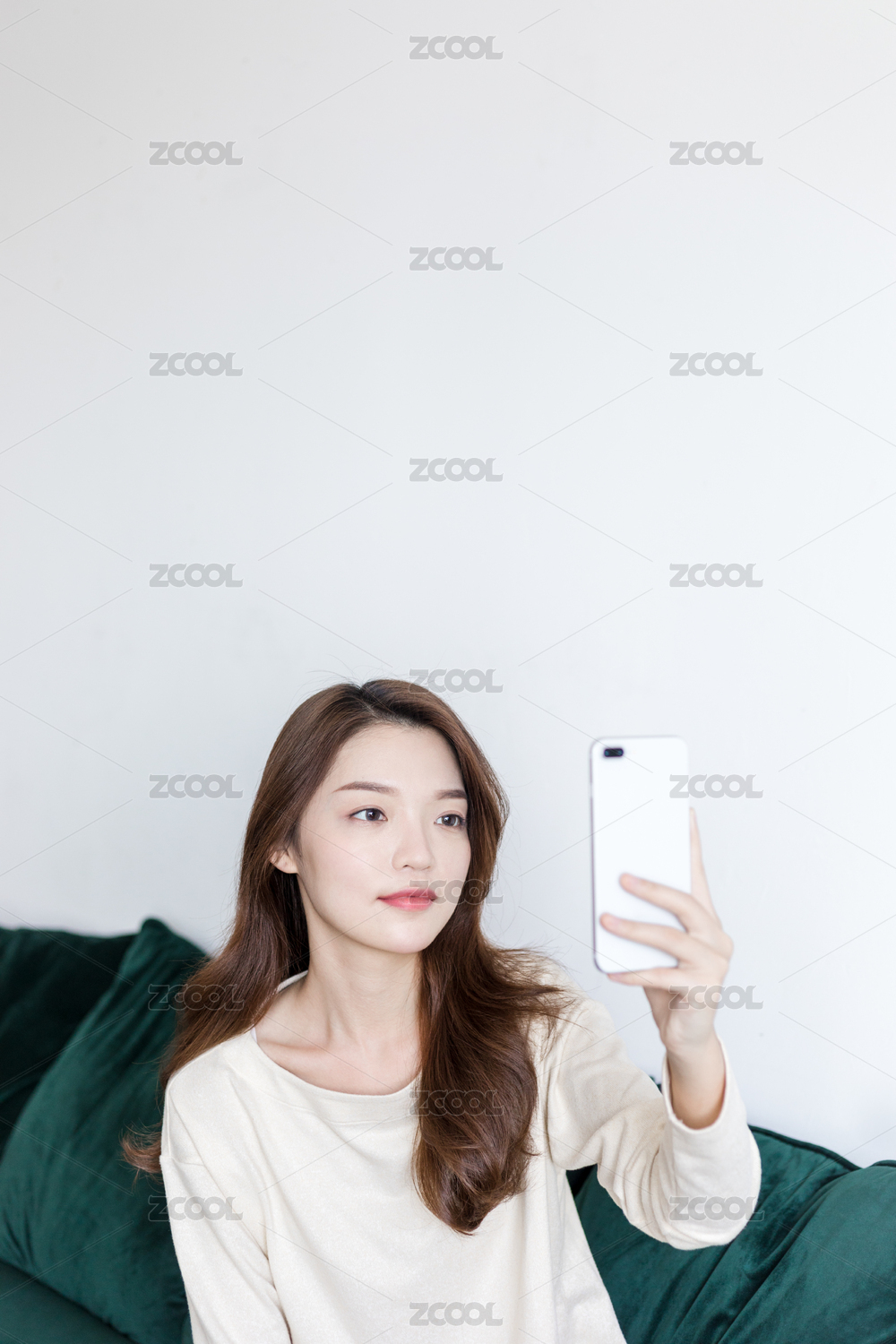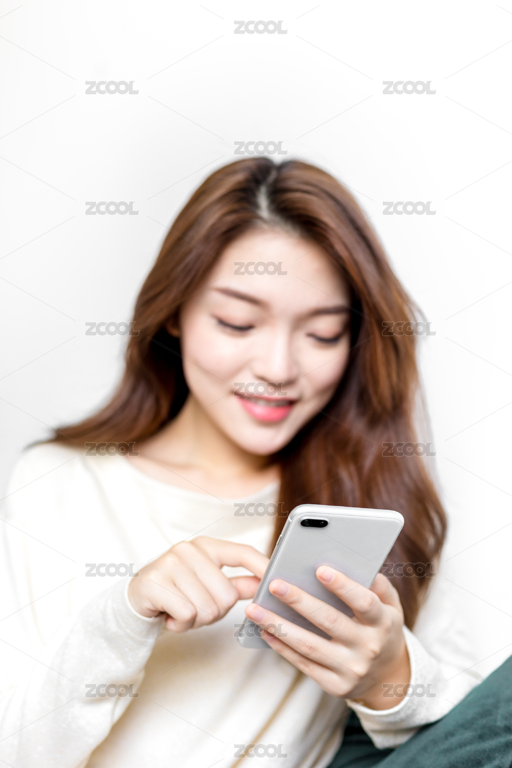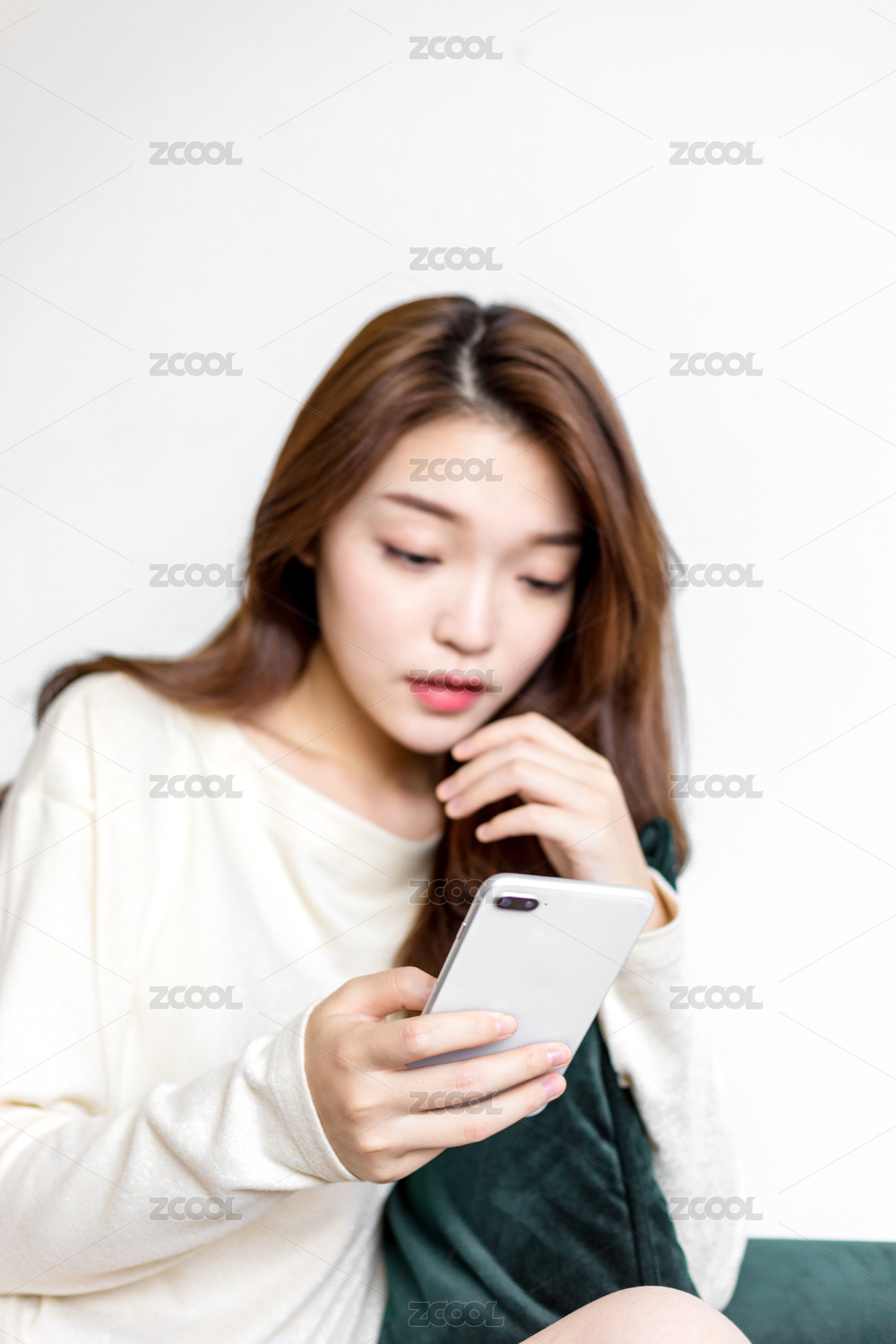 白色背景前准备操作手机的美女