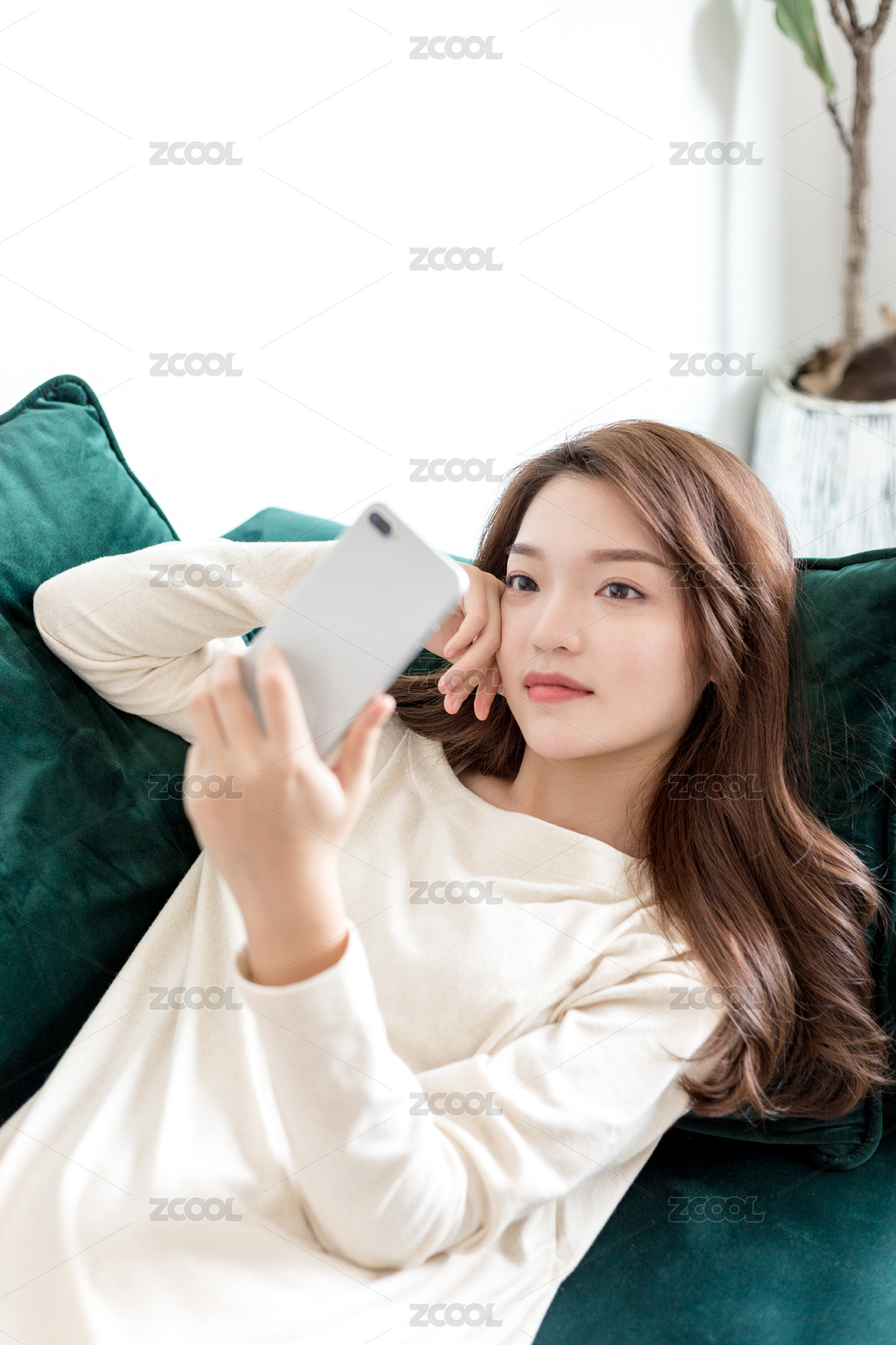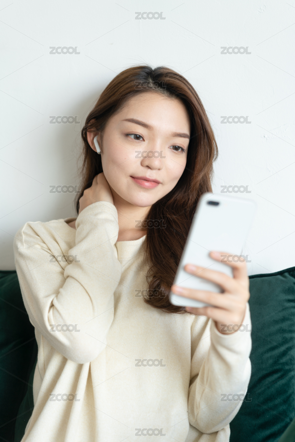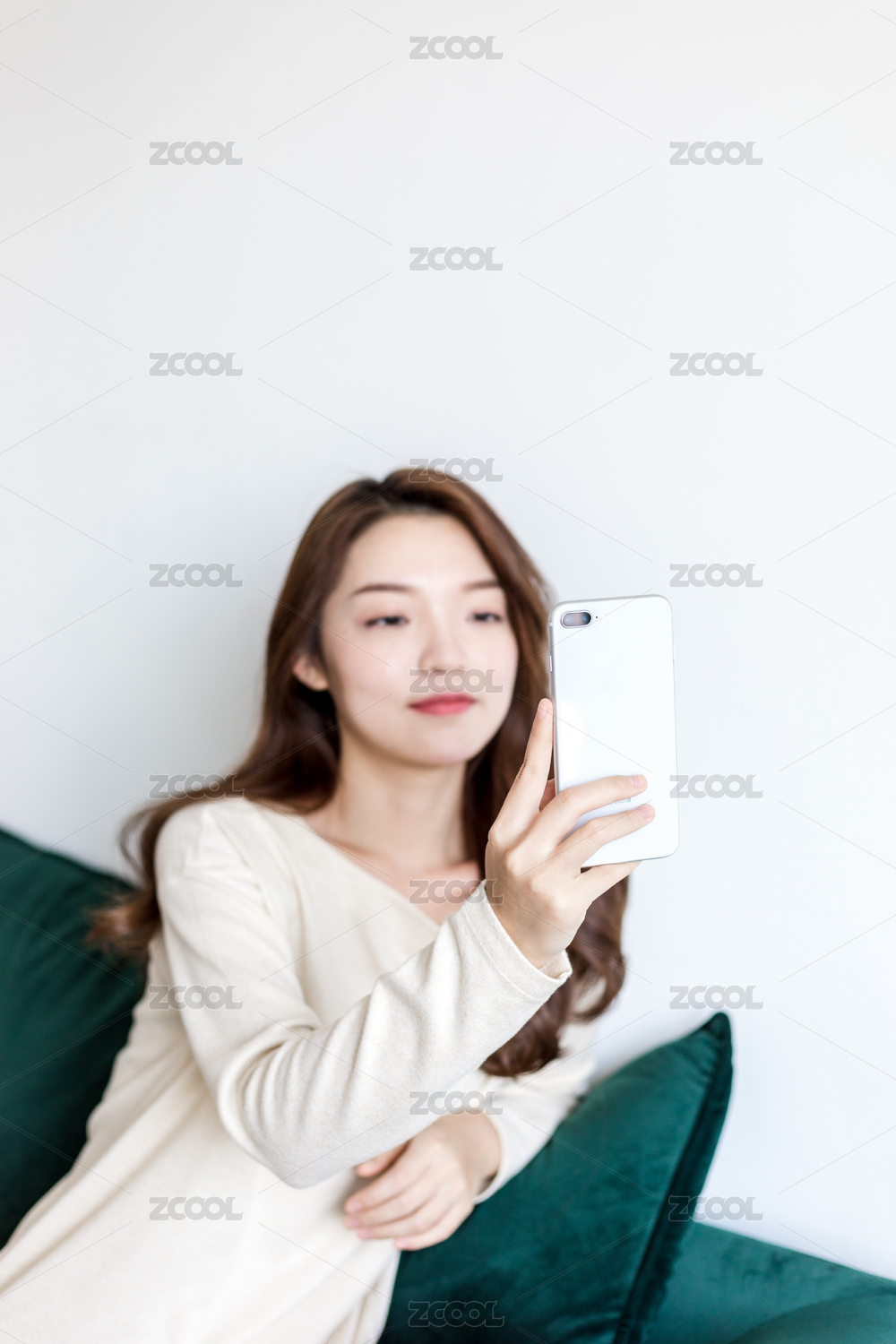 年轻女孩坐在沙发上使用手机