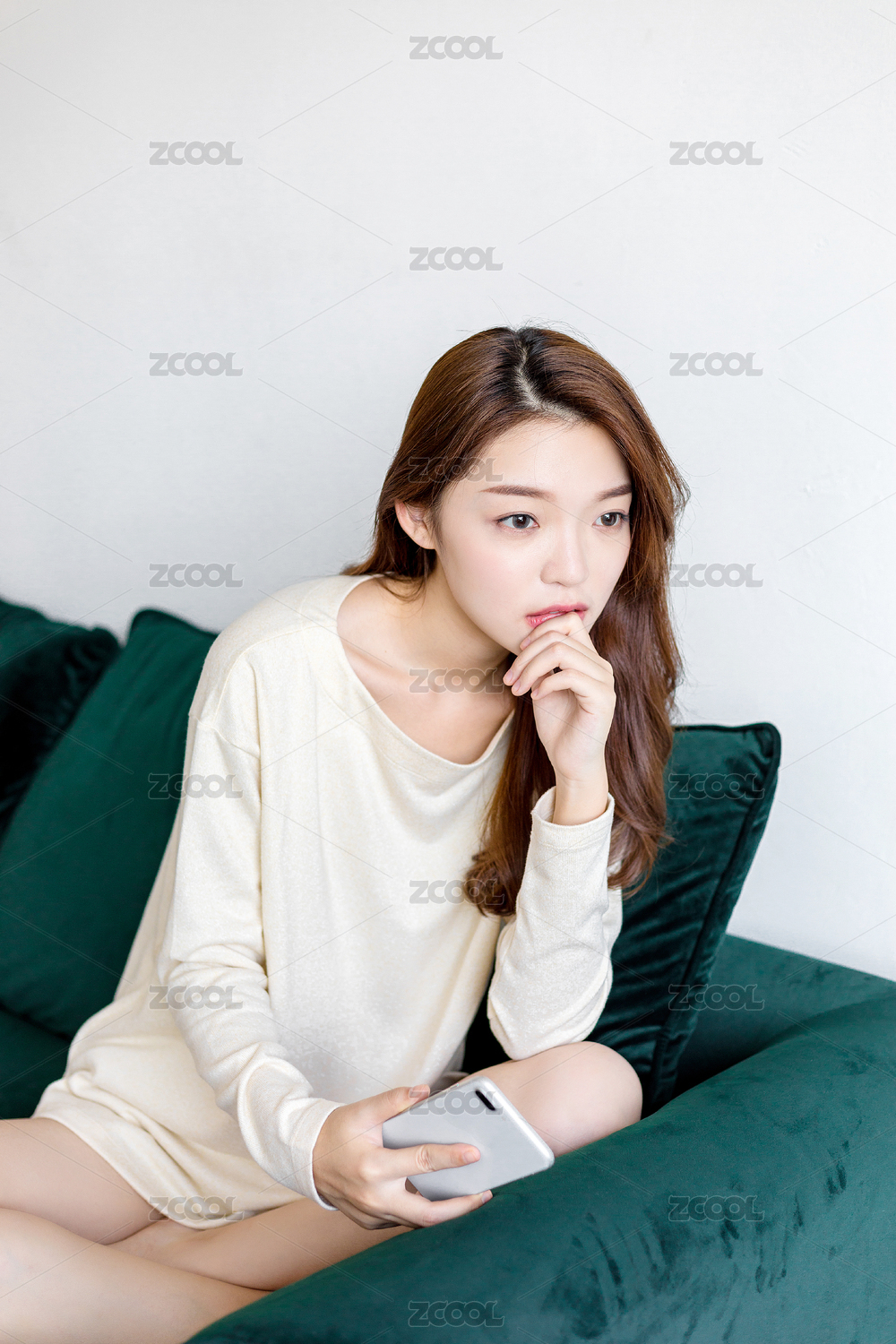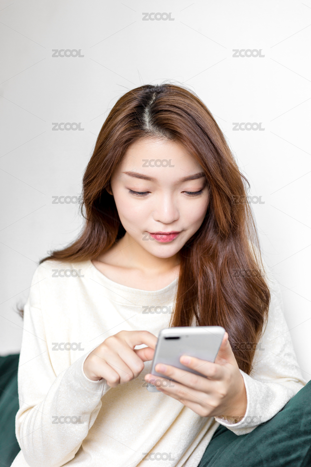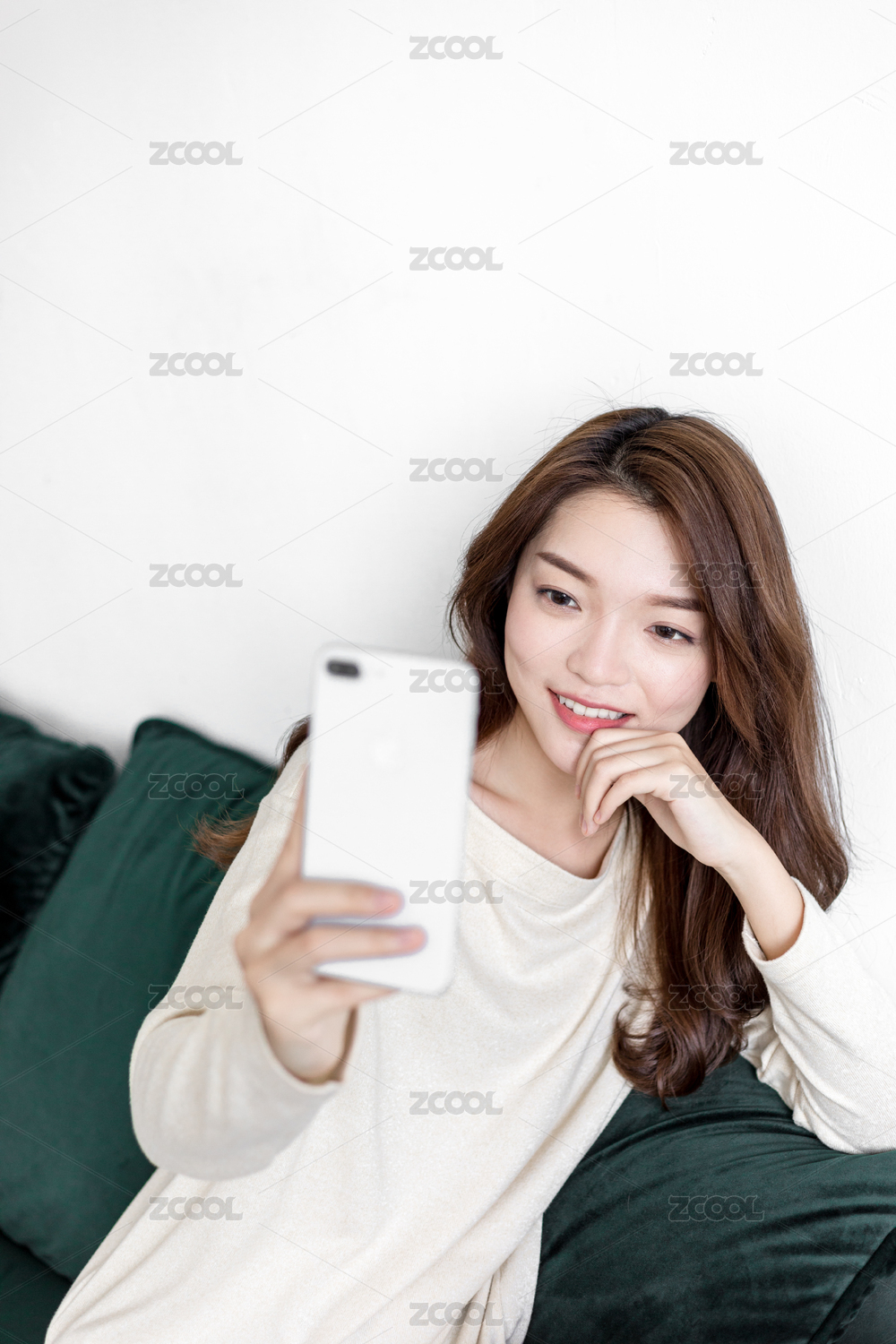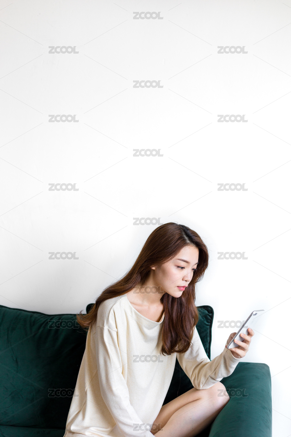 年轻女孩坐在沙发上使用手机