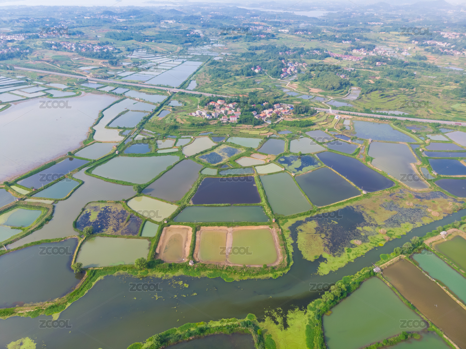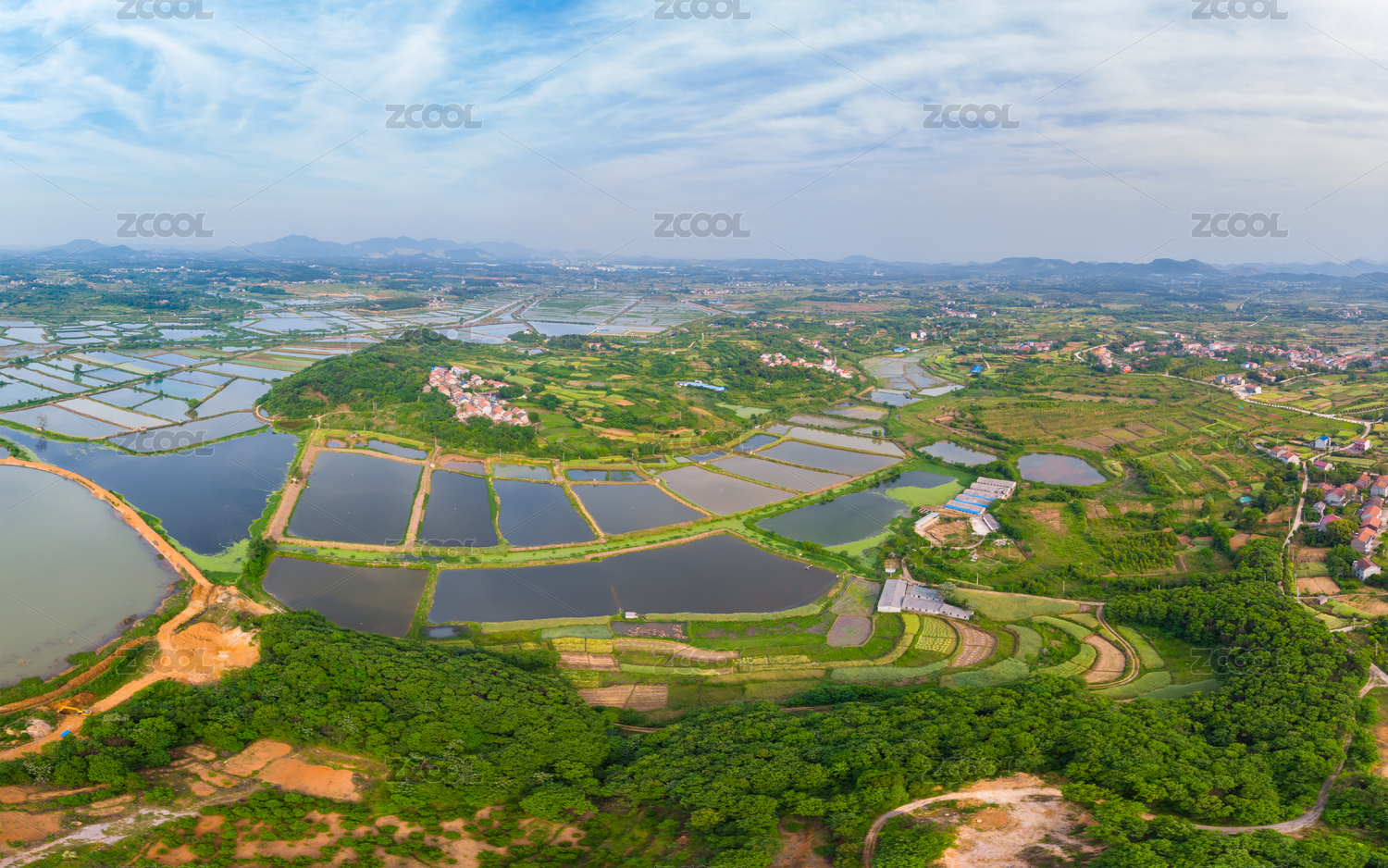 航拍乡村田野鱼塘