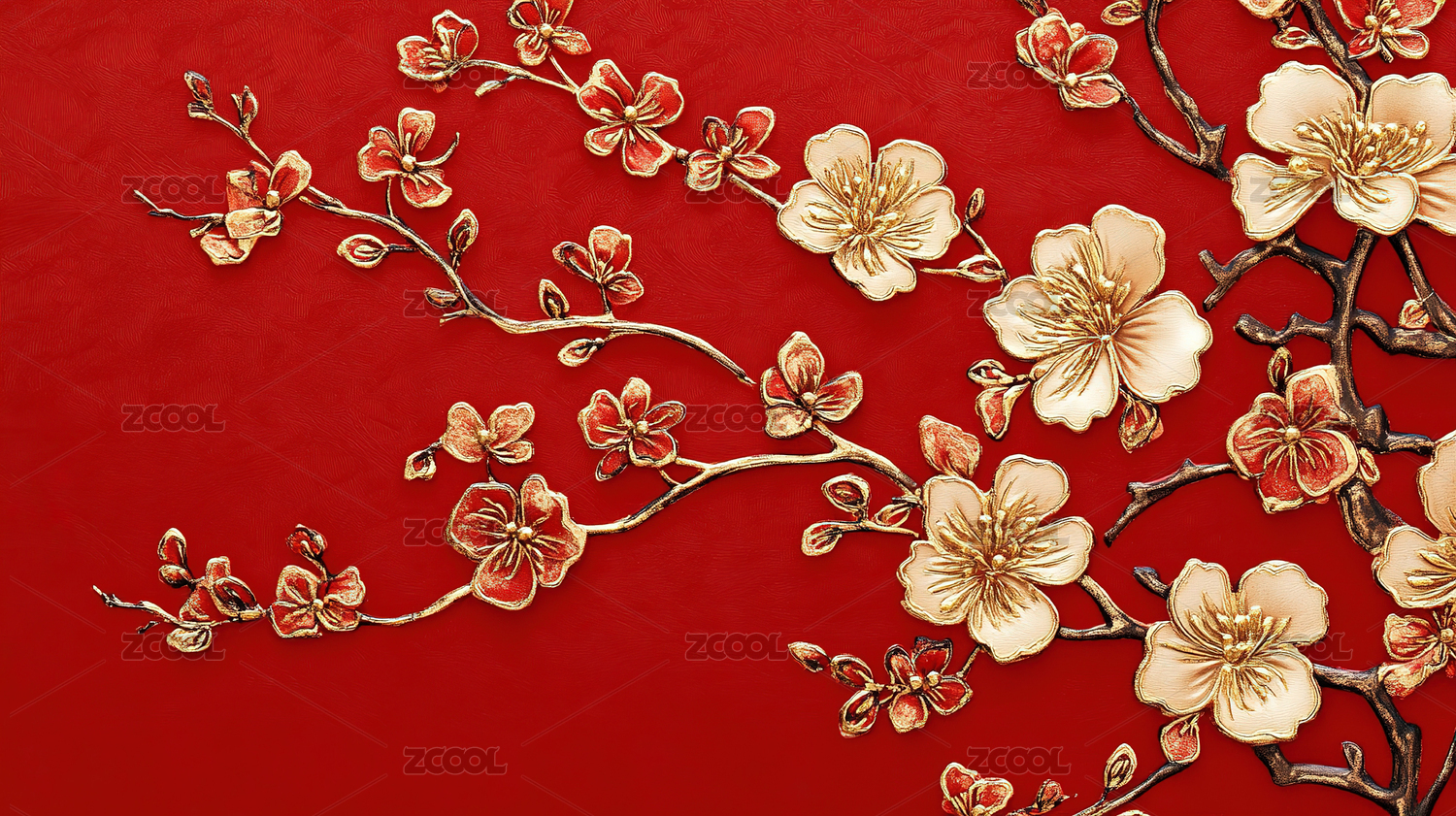 红色背景下,金色元宝和装饰灯笼的节日景象