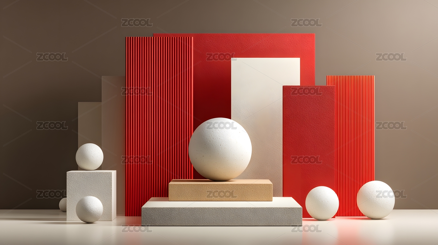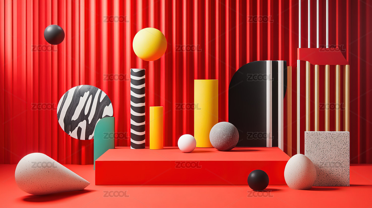 红色背景下的几何形状和球体