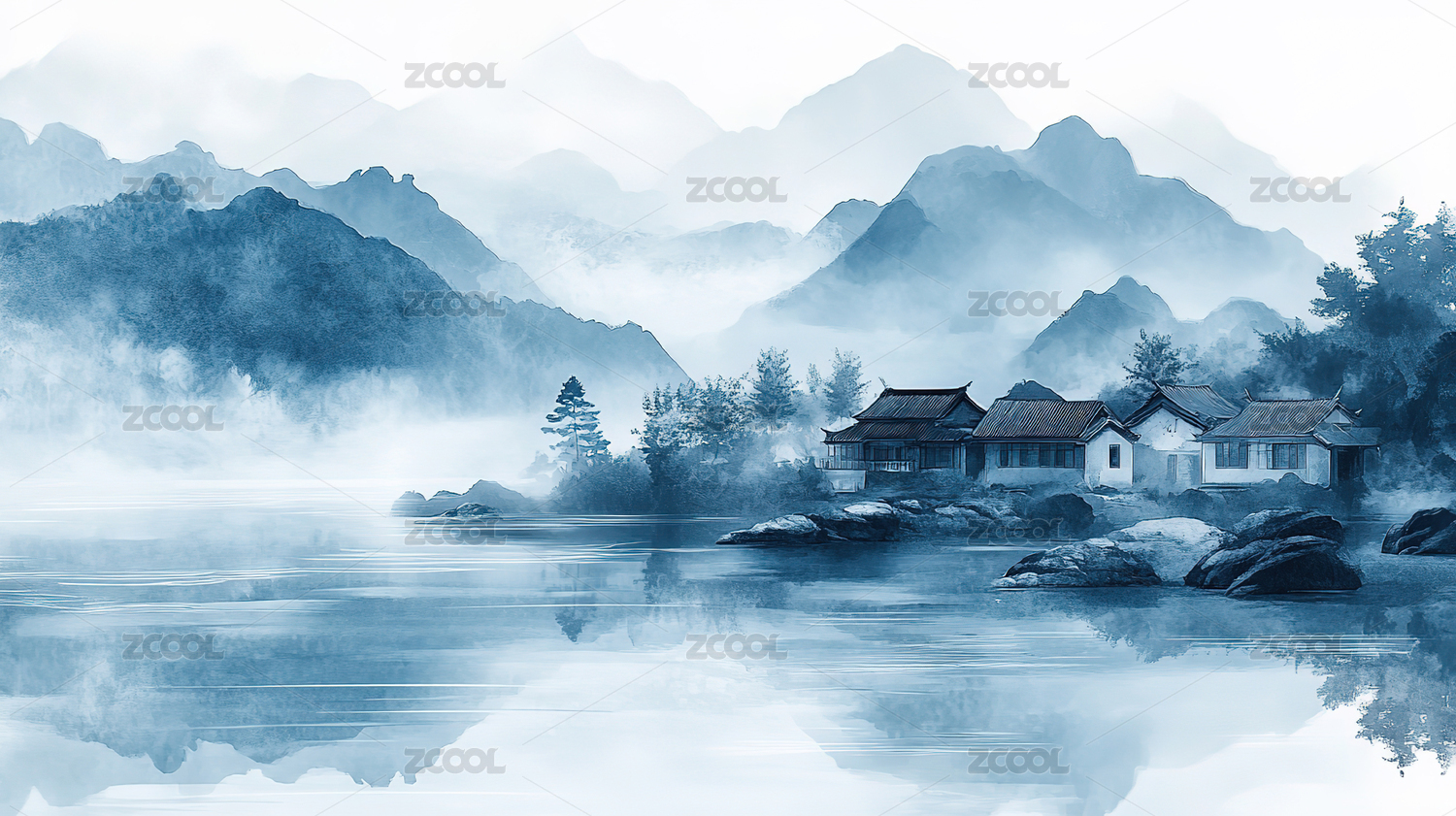 蓝色调的水墨风山水画,水墨风意境山水画概