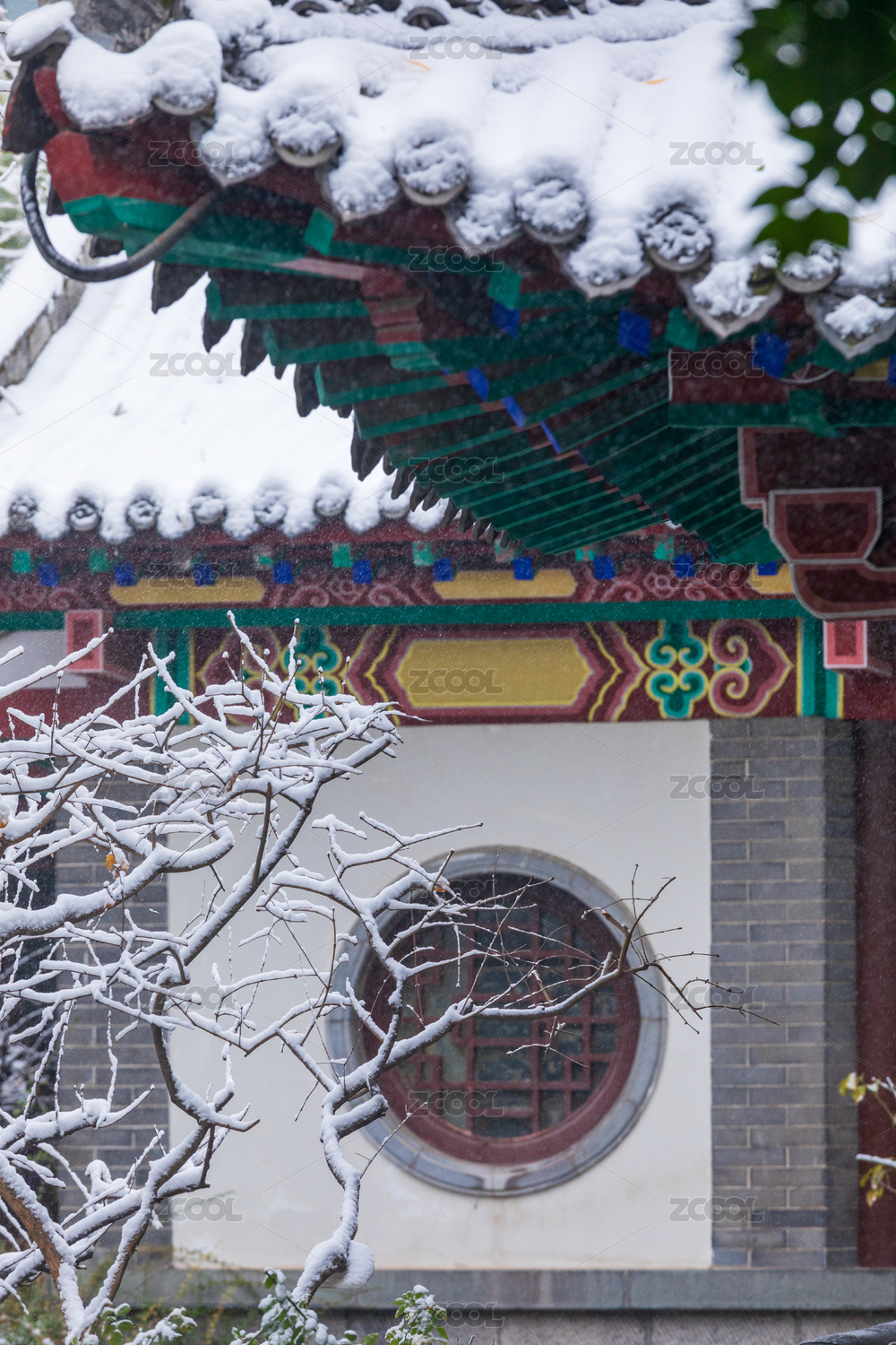 中国北京冬季景山公园辑芳亭雪后建筑风光