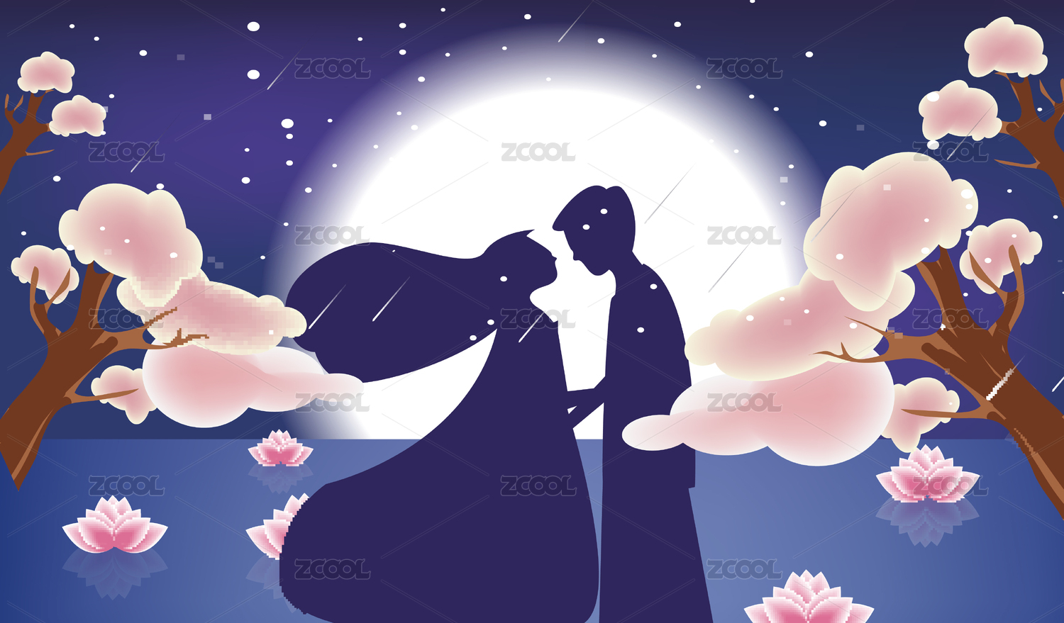 一对情侣在月亮前拥抱的矢量插画