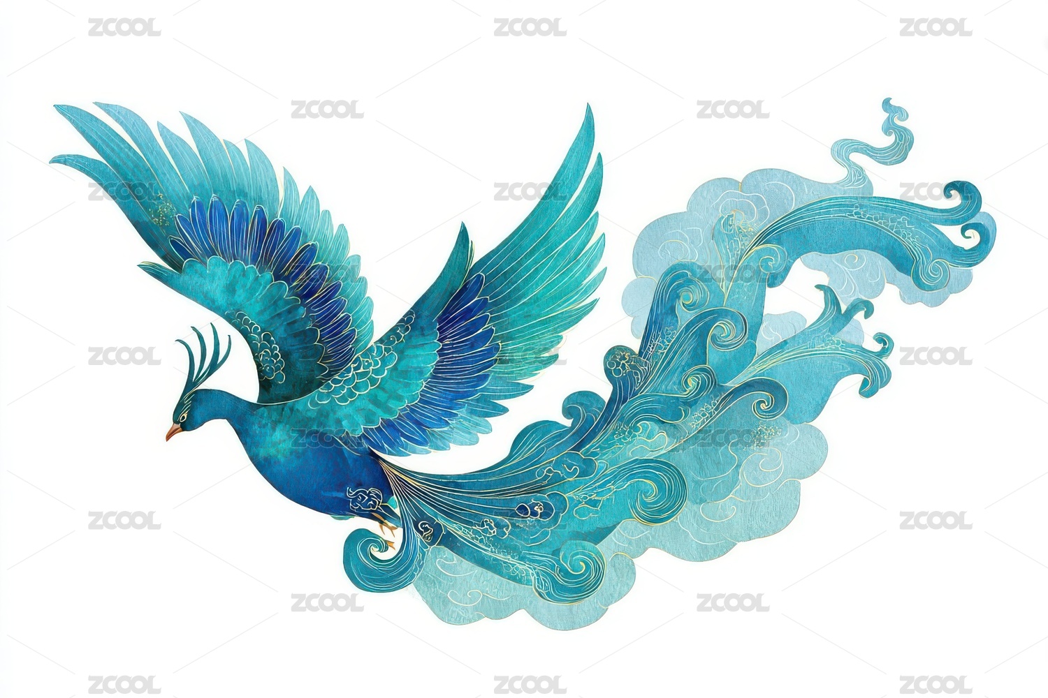 蓝羽凤凰展翅飞翔于祥云之间