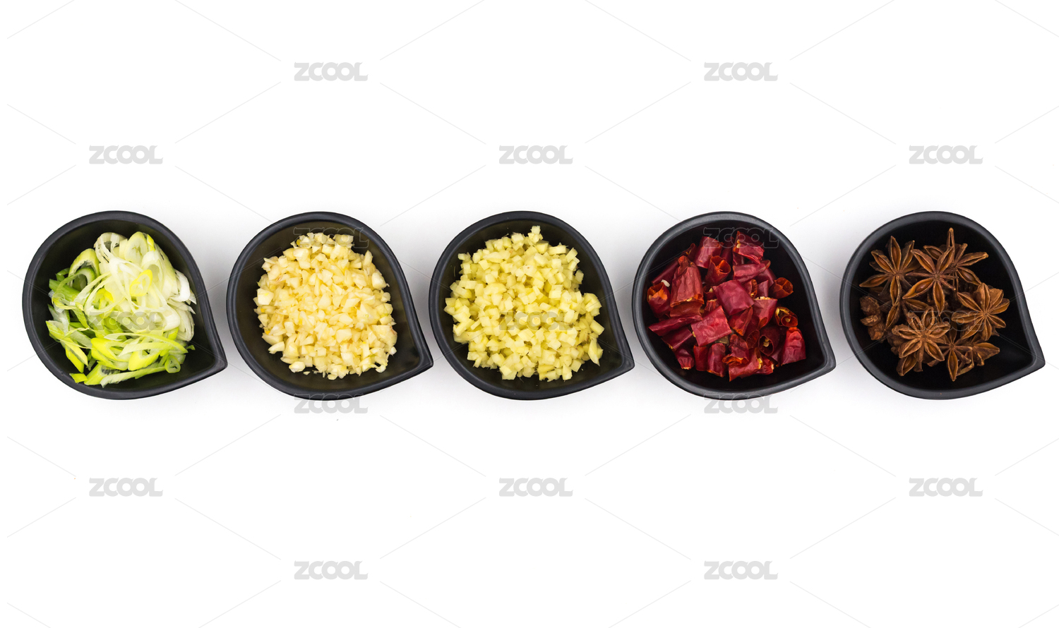由碗和木托盘装着的七种不同种类的美食放在深绿色背景上,代表东西方不同地域的美食文化。