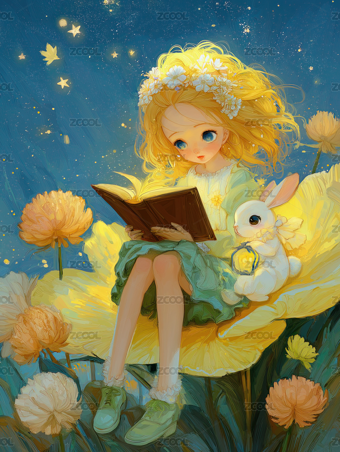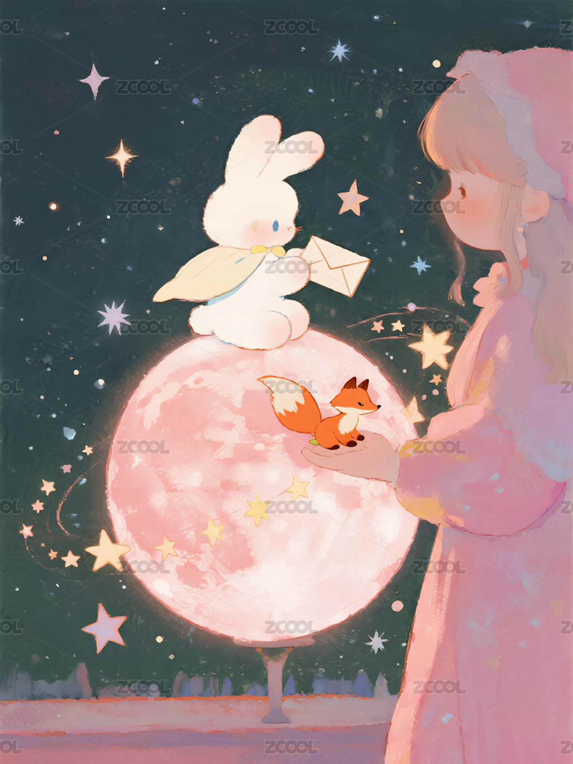 手里拿着星星棒戴着帽子看月亮的小女孩