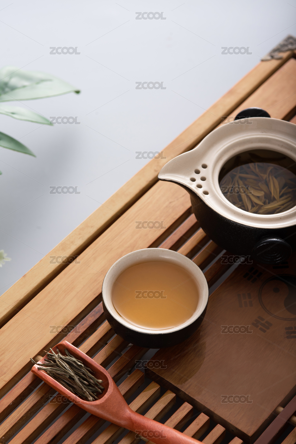 茶盘上放着茶杯茶壶泡好的茶干茶叶