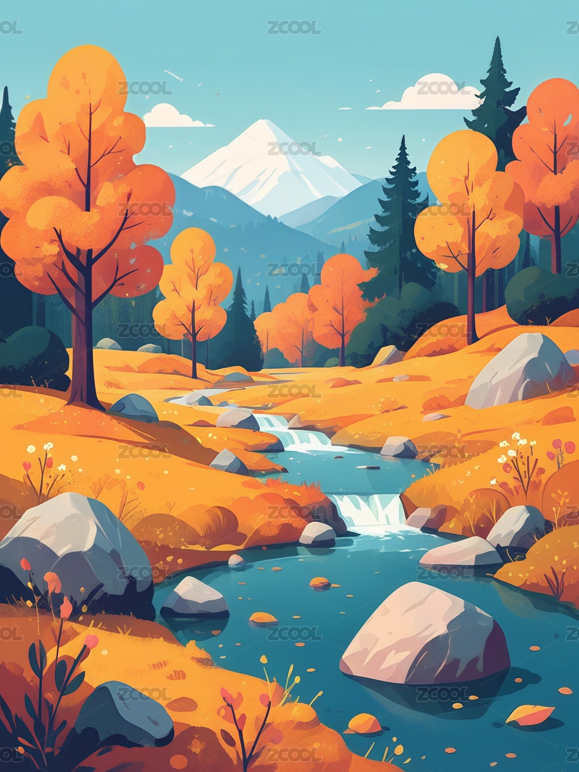 雪山,树林,秋天,小溪,风景,竖构图,草地,远山,山川,天空