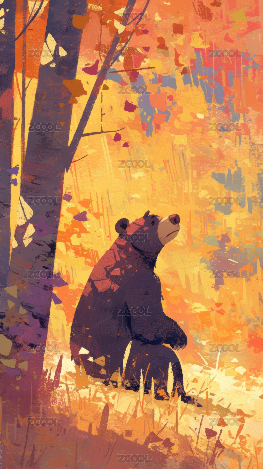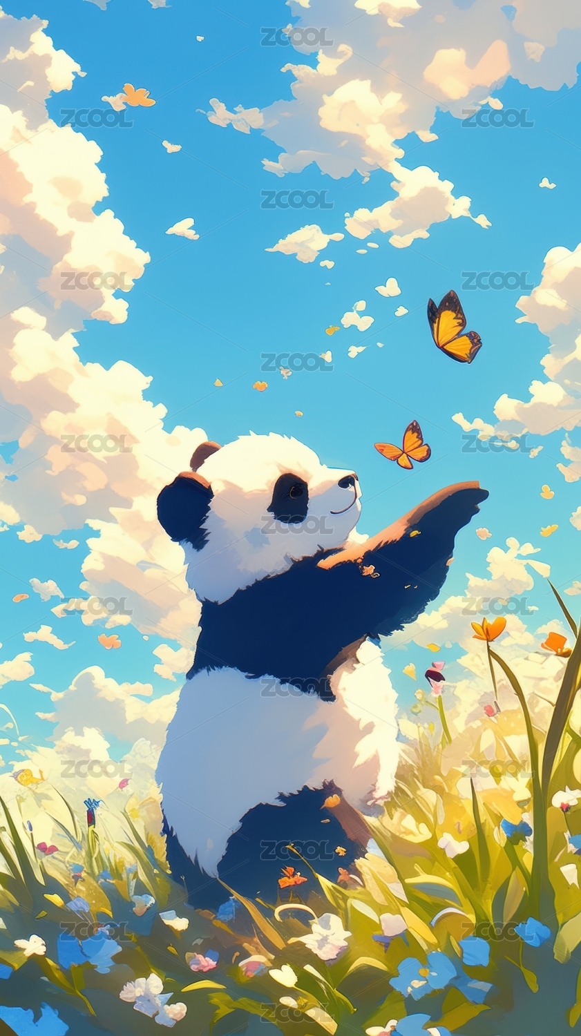 AIGC,坐着的熊,草地,平面插画风格,蓝天绿草