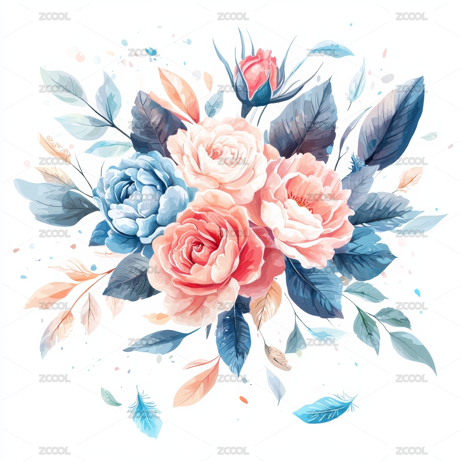 蓝色与粉色相间的优雅花卉插画