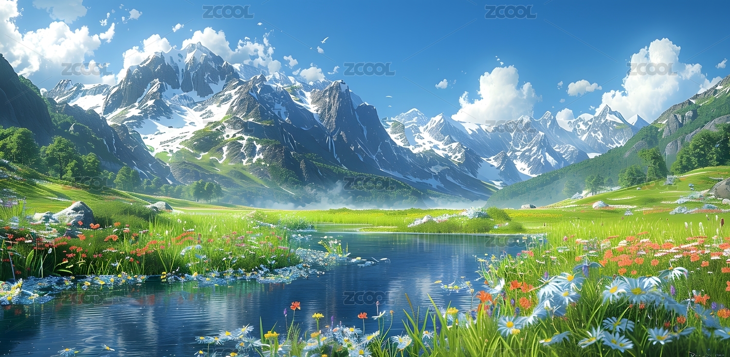 雪山湖泊草原风景画