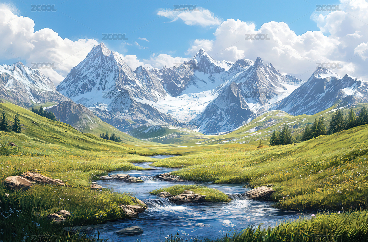雄伟的山脉草地溪流风景油画