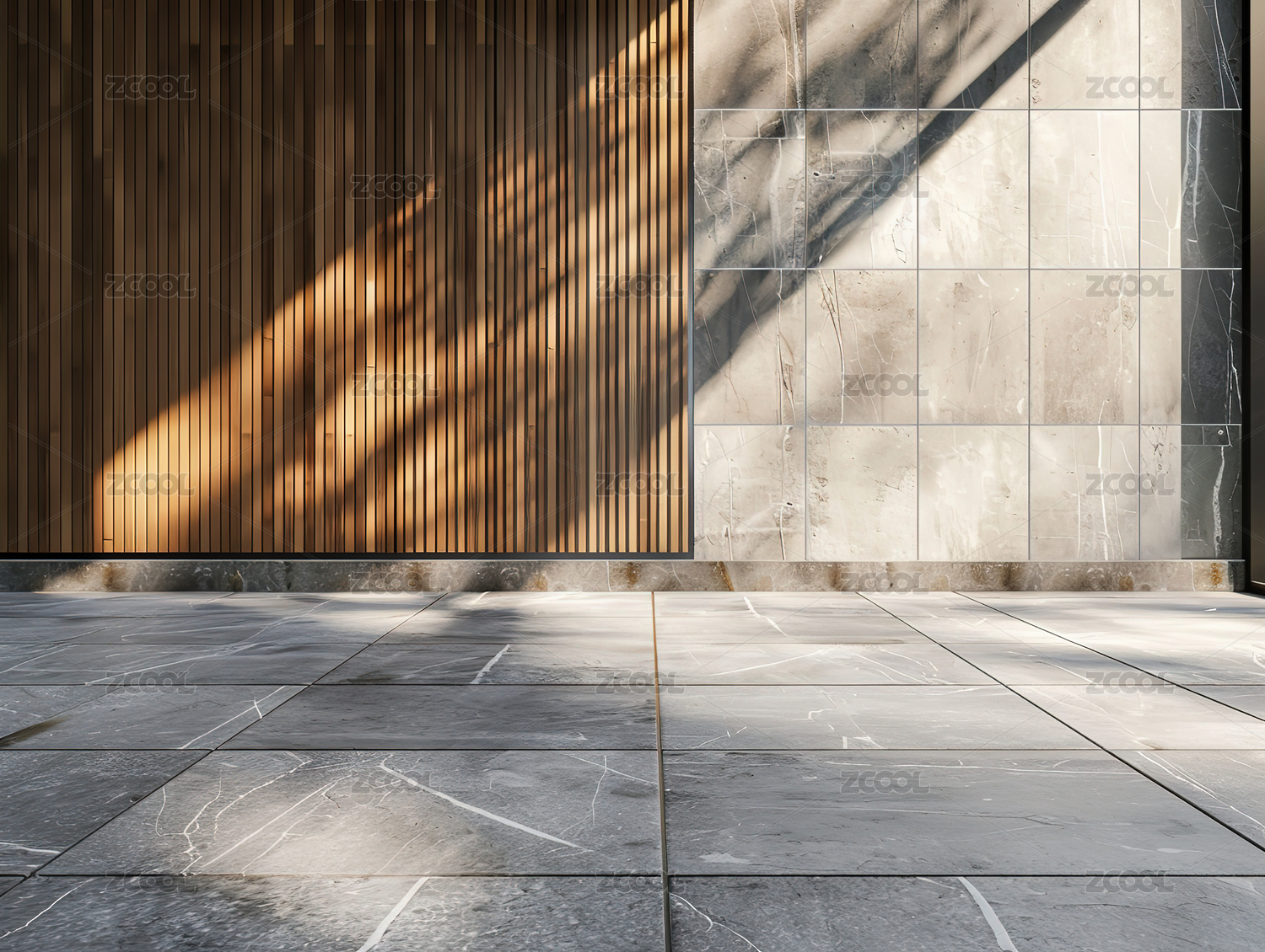 混凝土墙与木条光影