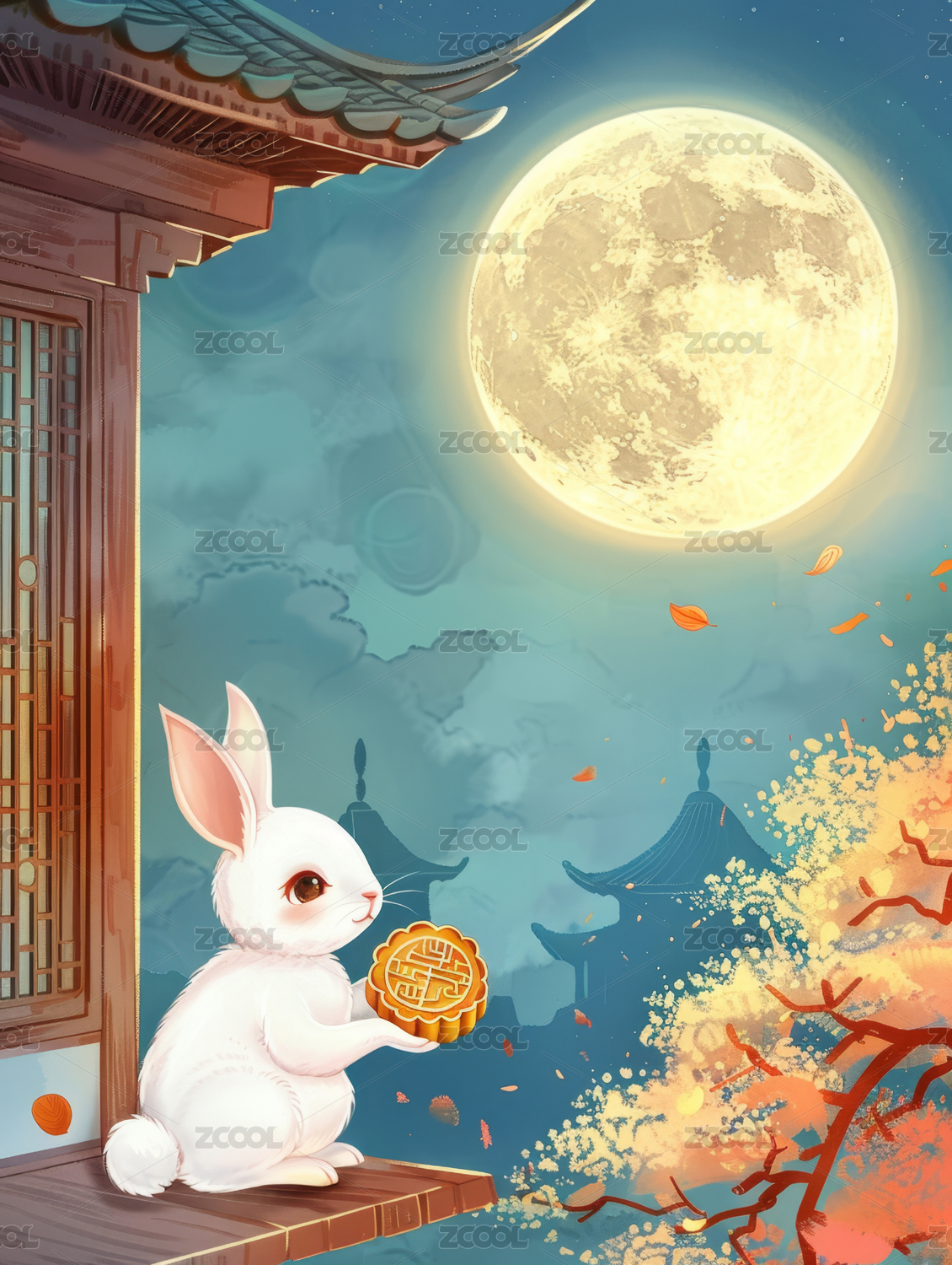 可爱的兔子抱着月饼中秋节节日庆典国潮插画