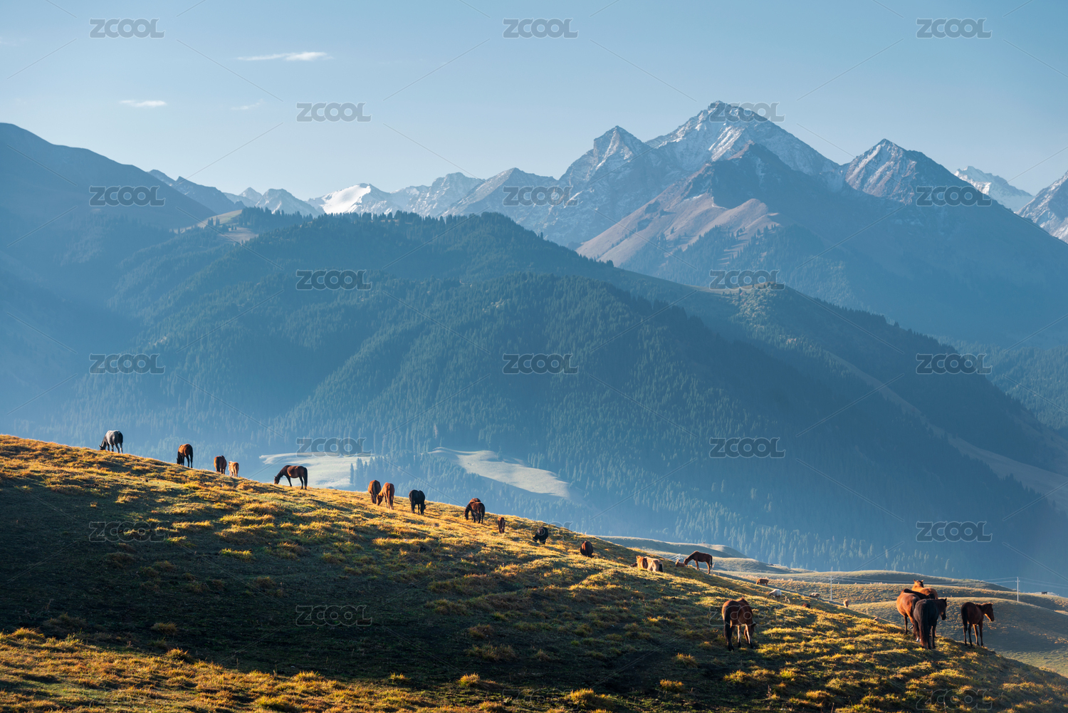 中国新疆琼库什台雪山原始森林草地马群自然风光