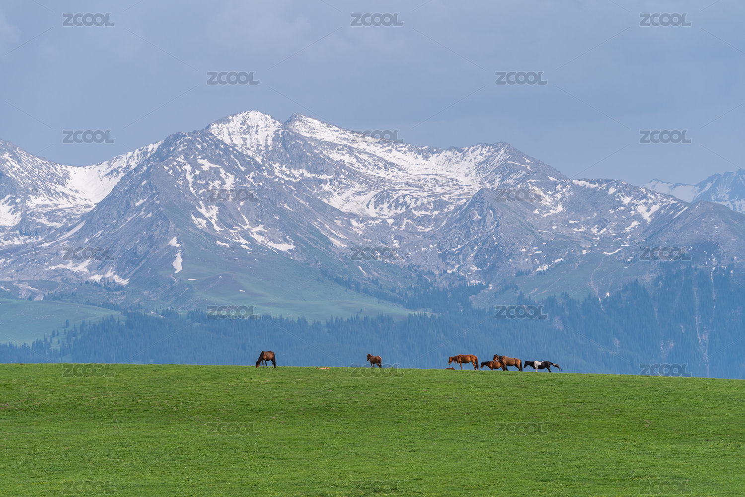 中国新疆伊犁那拉提的雪山草地森林与牧场
