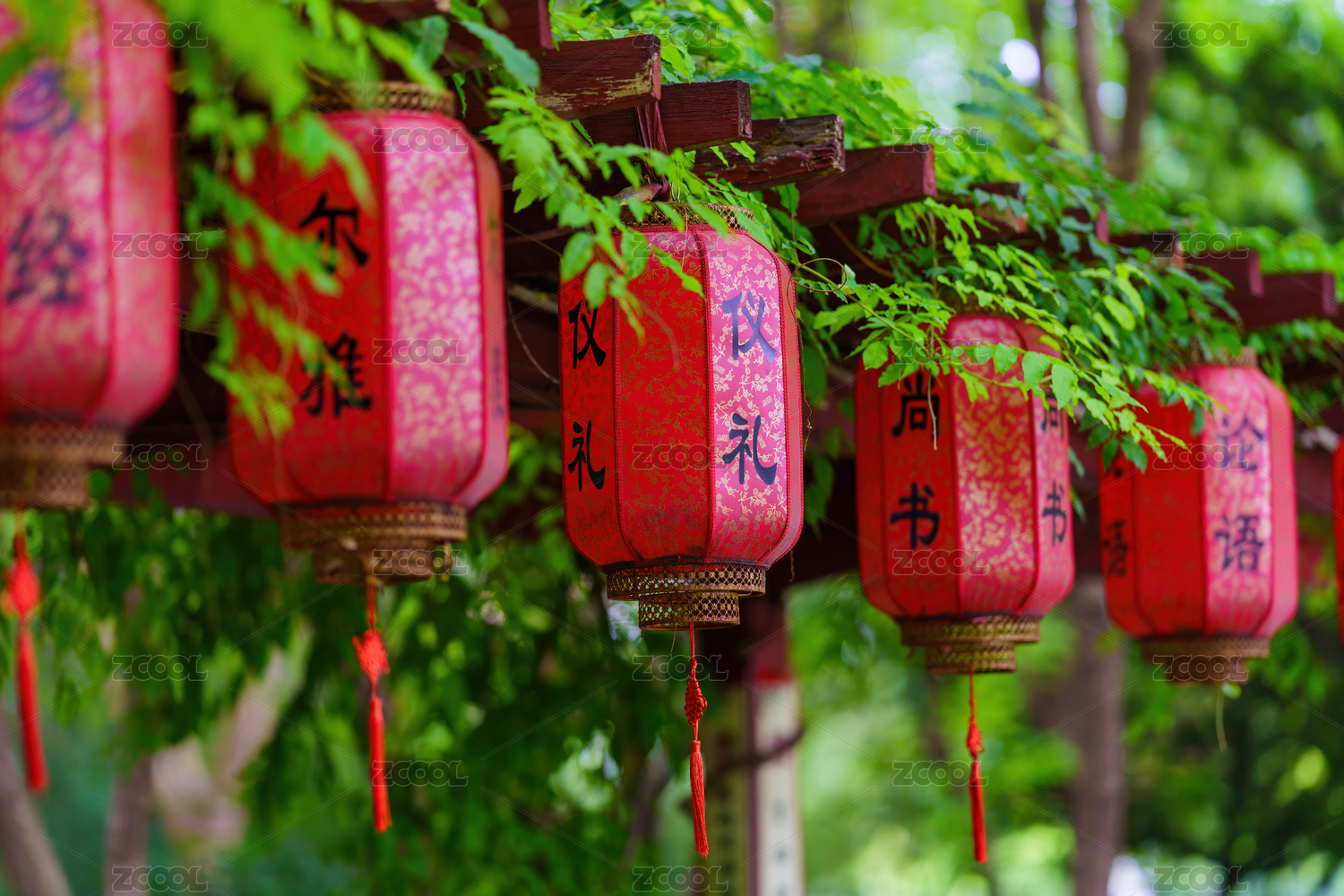 宁波七塔禅寺藏经阁前中国传统红色祈福缎带