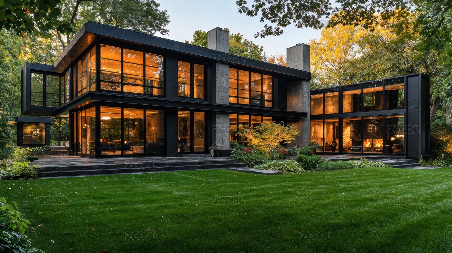 玻璃窗现代风格的绿色住宅